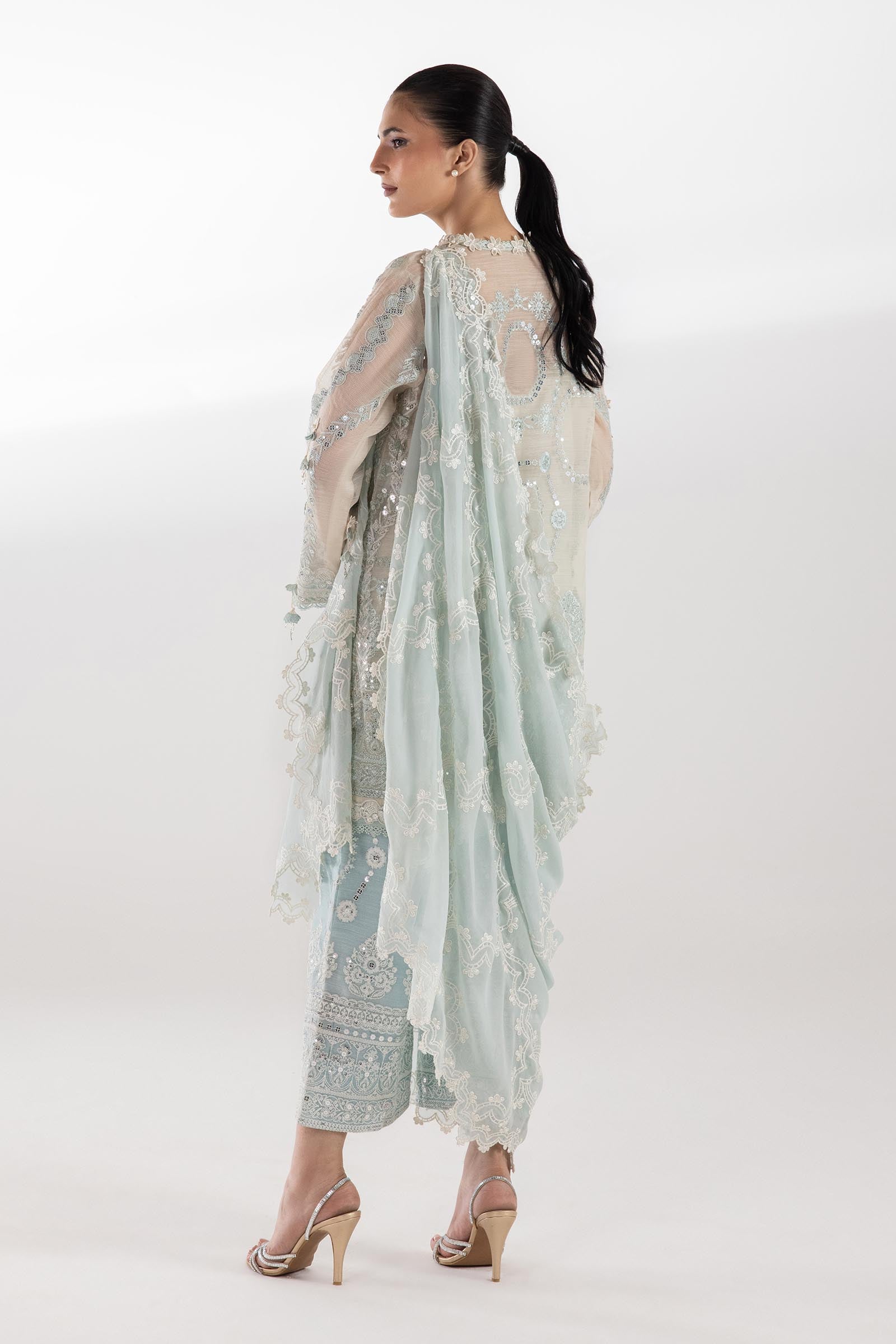 Description: A silhouette kissed with skylit tones, refined by a delicately draped dupatta.