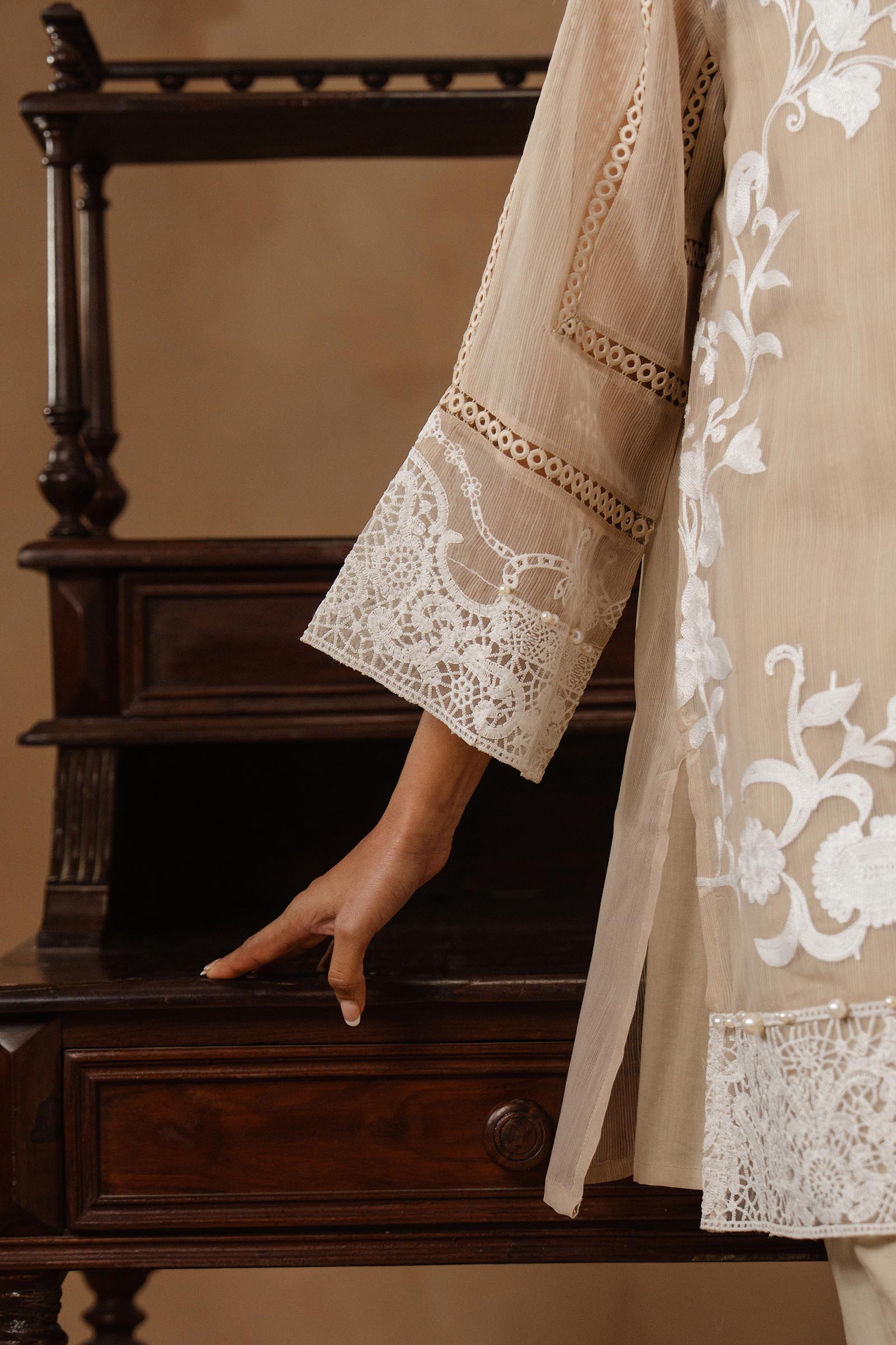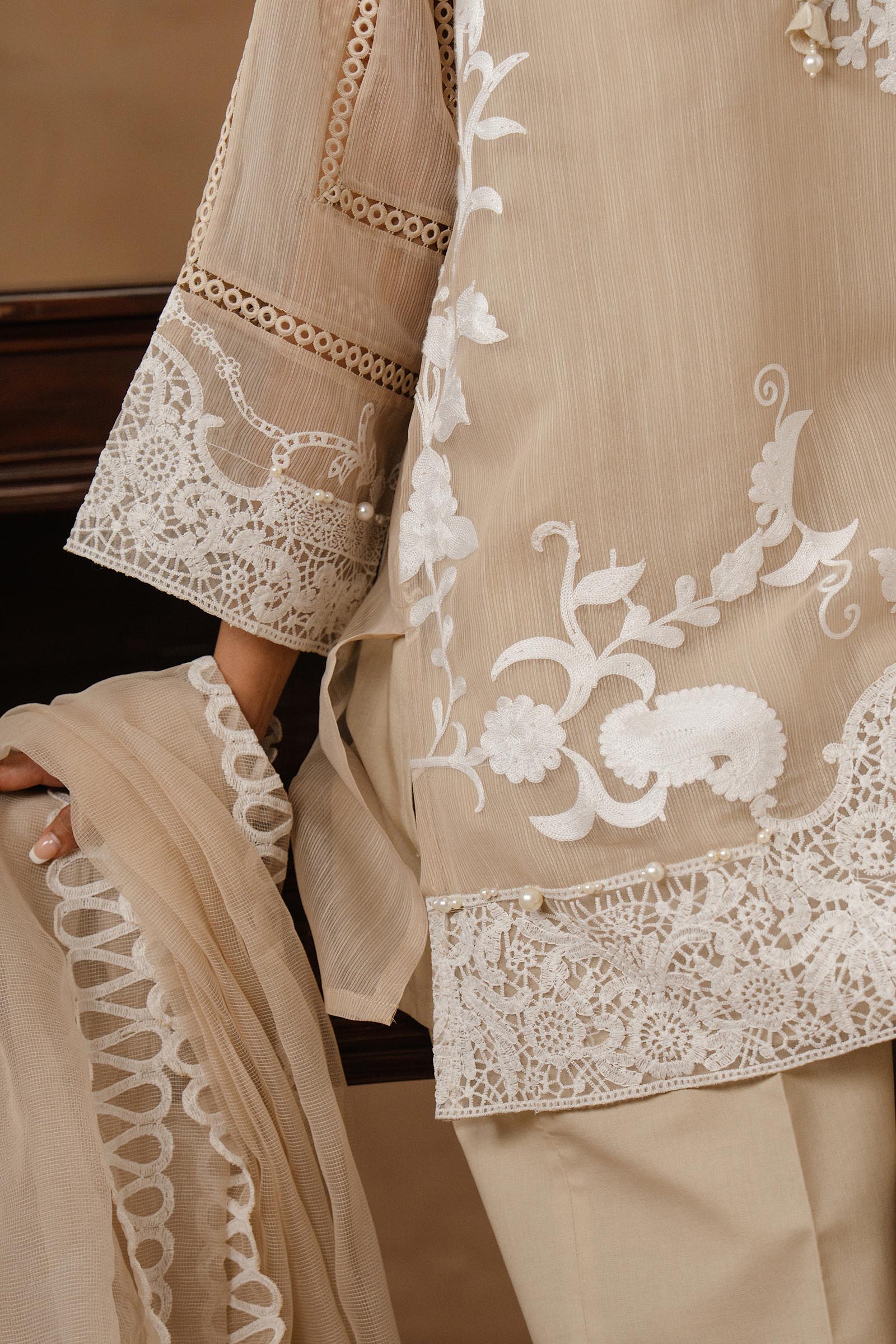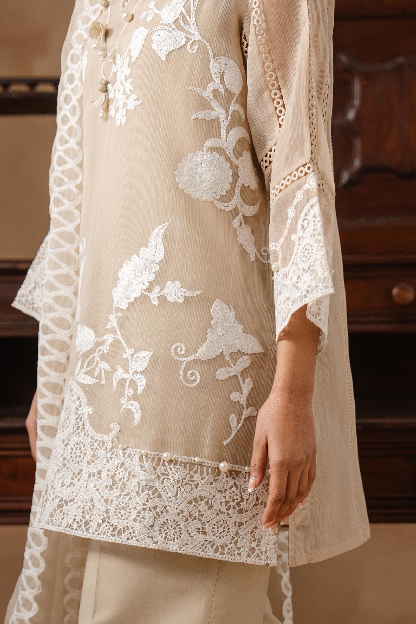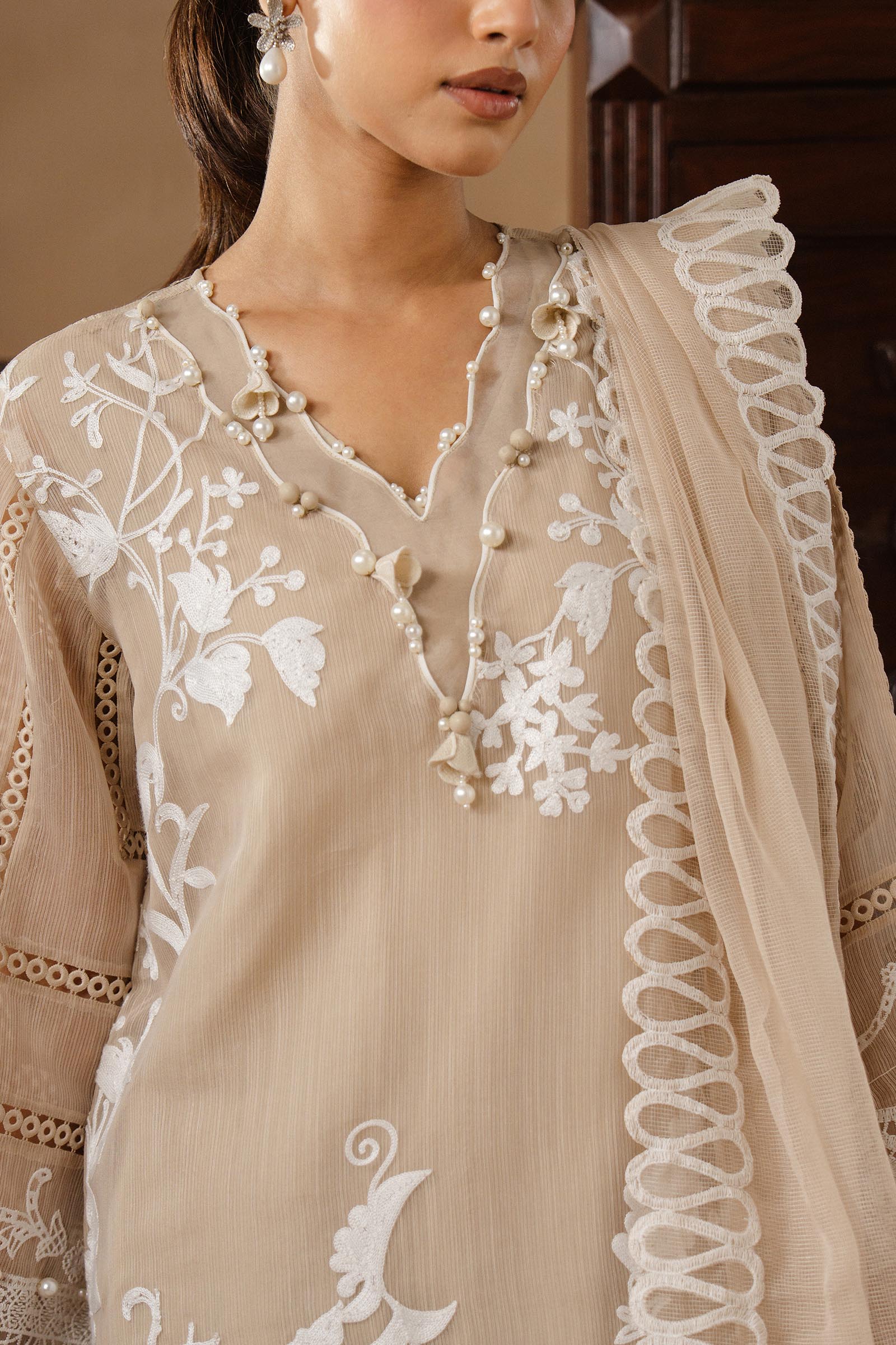 Delicate embroidery paired with flowing organza, where soft hues meet effortless, ethereal elegance.