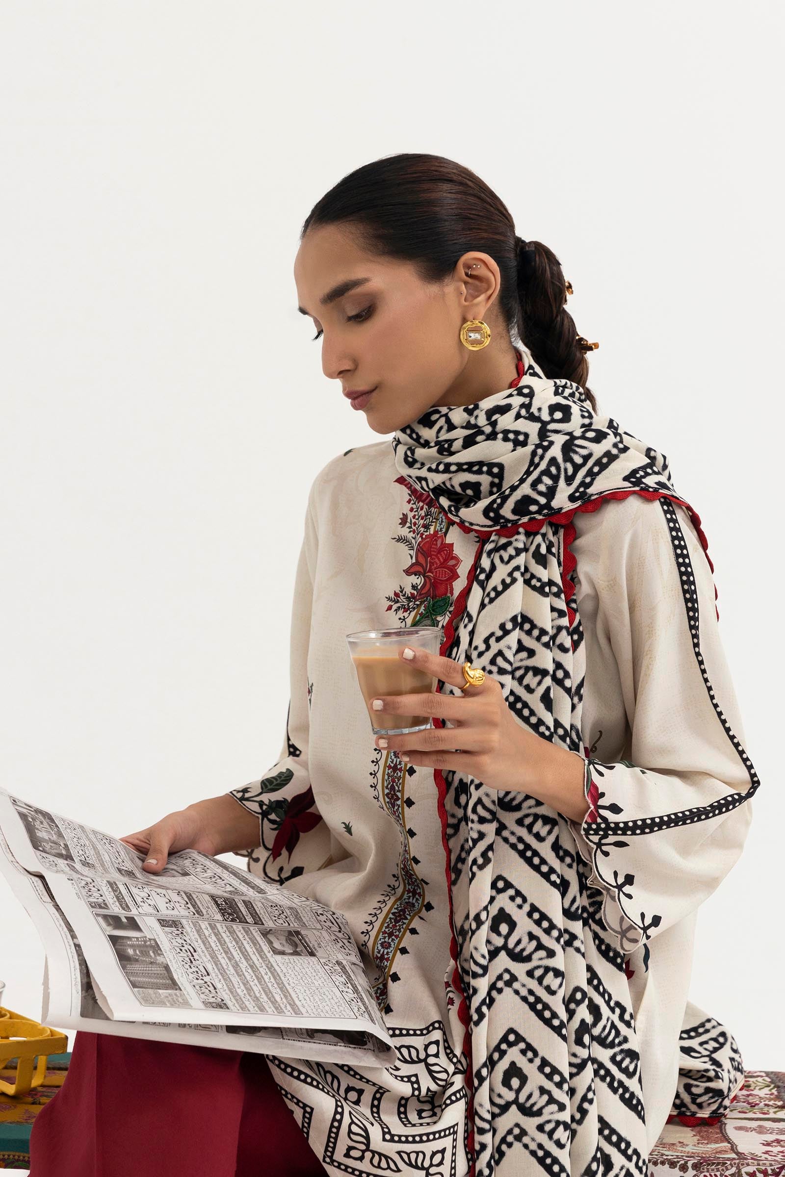 A digital-printed Chintz, Block, and Batik fusion in shades of red on cream, with a geometric block-print dupatta and contrasting pants.