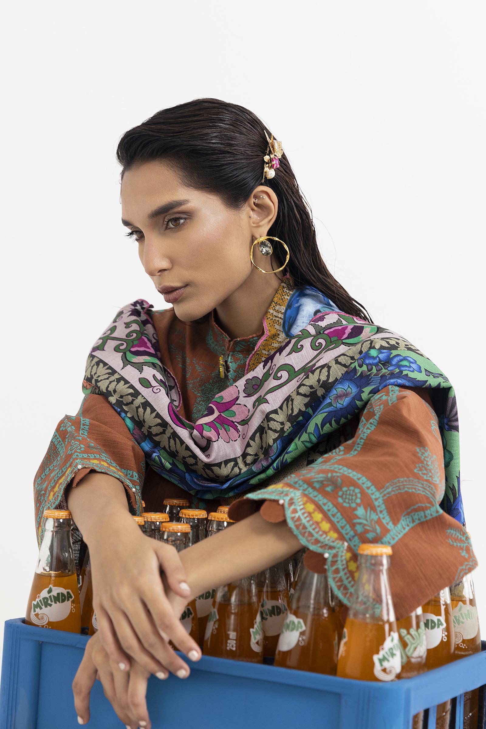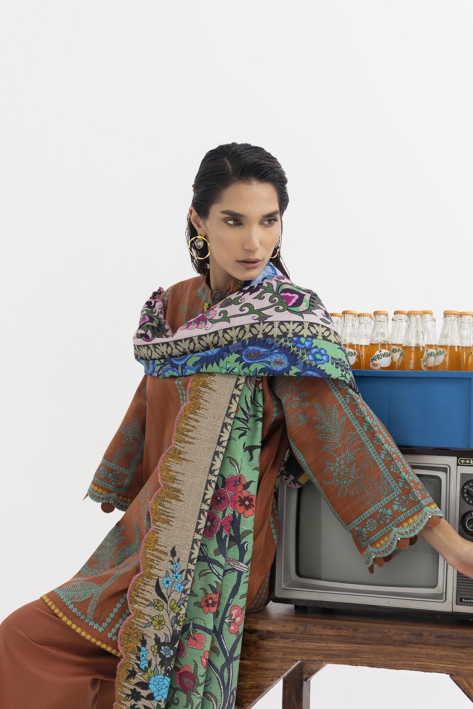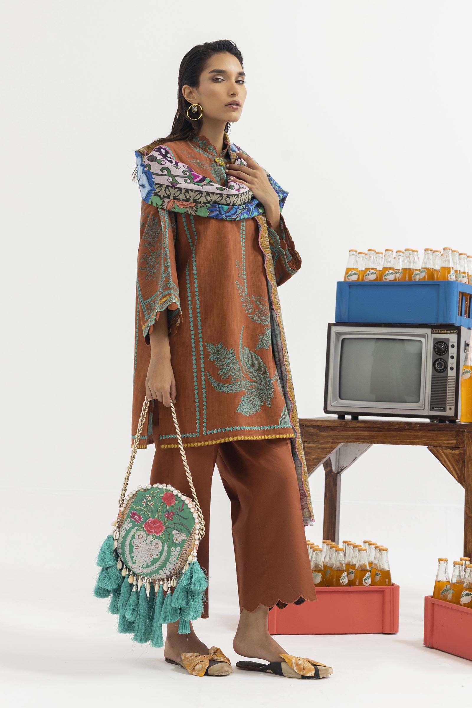 Trellis block-print shirt in emerald green on burnt coffee brown, paired with a multi-colored Turkish-architecture block-print dupatta and matching pants.