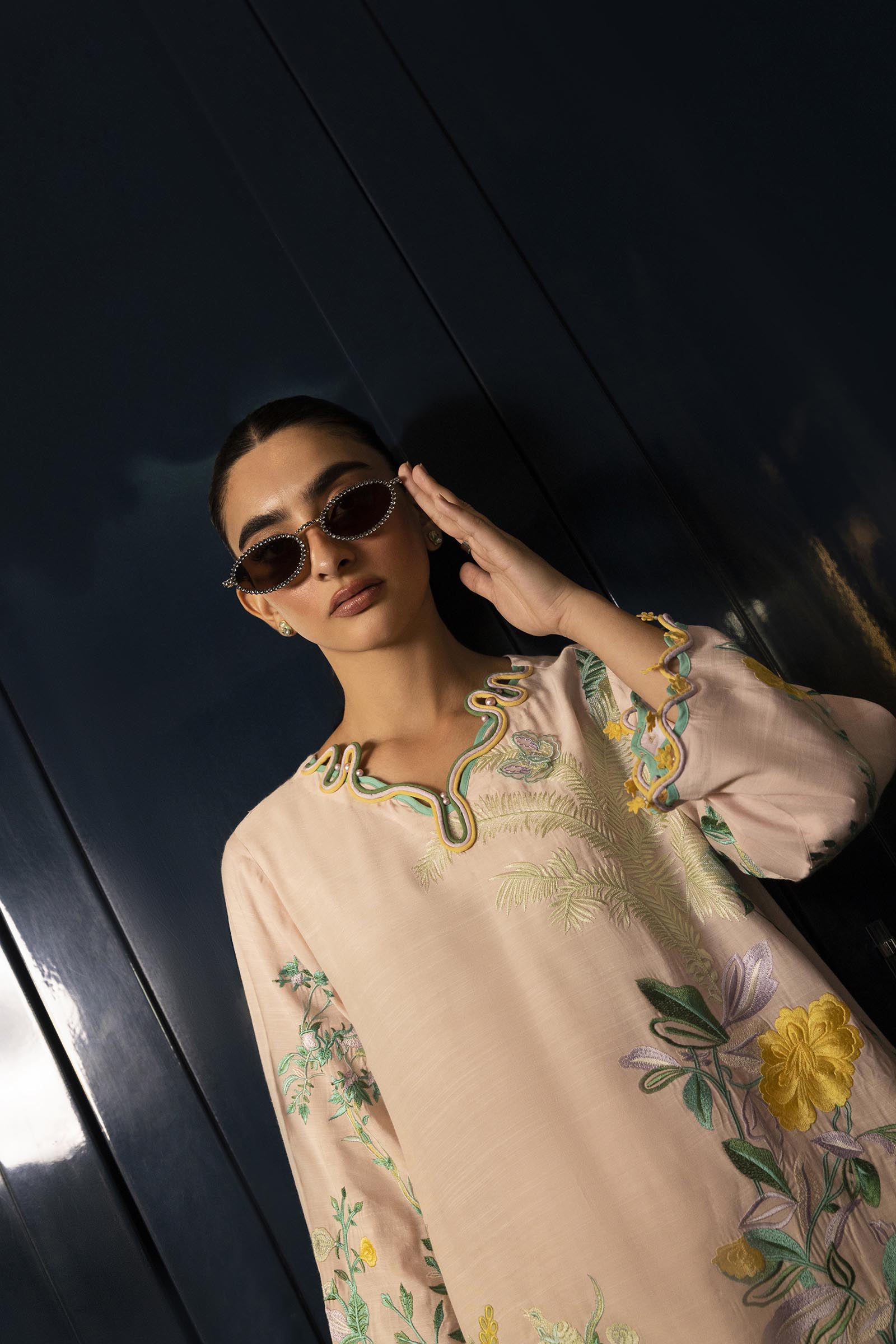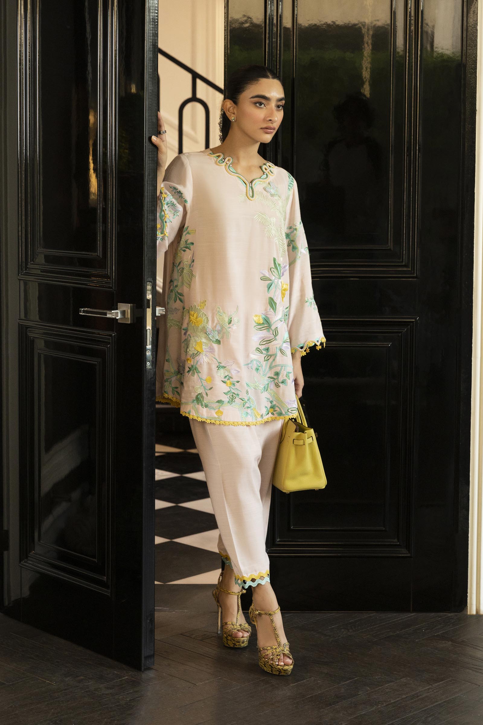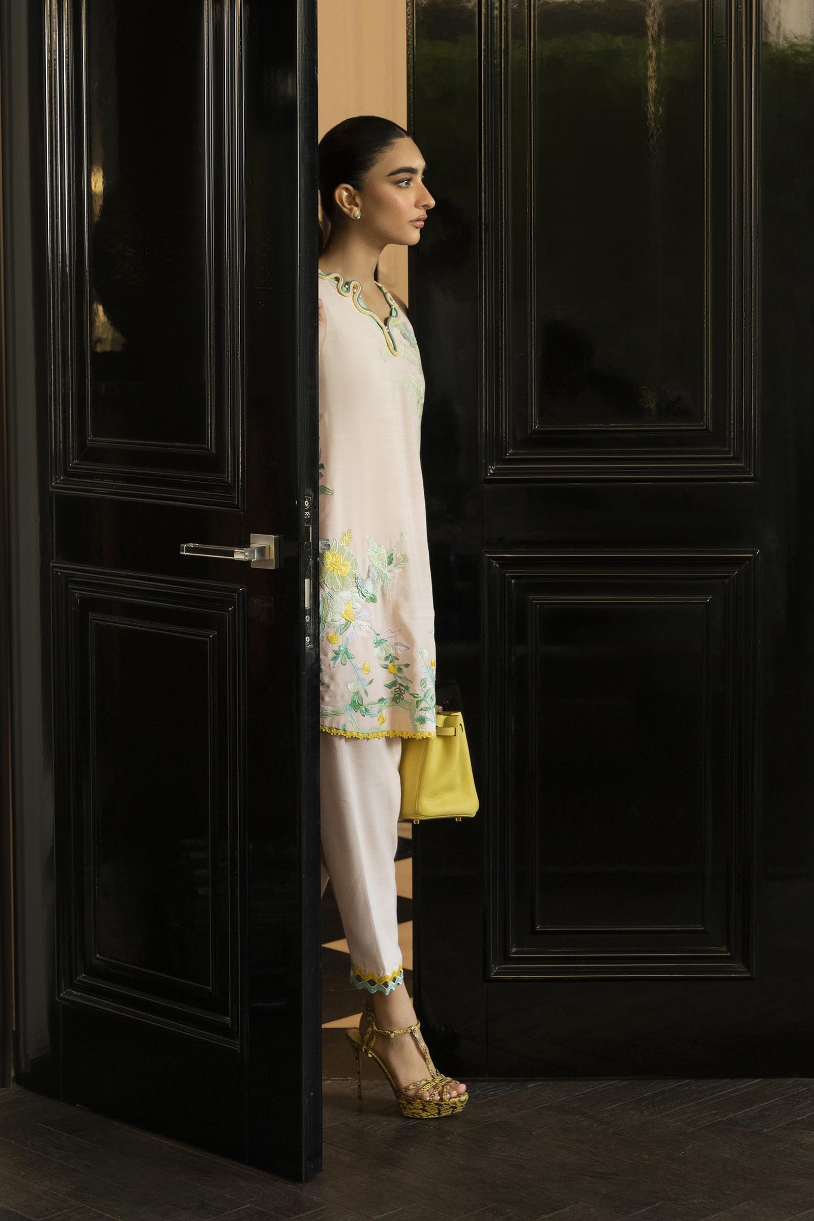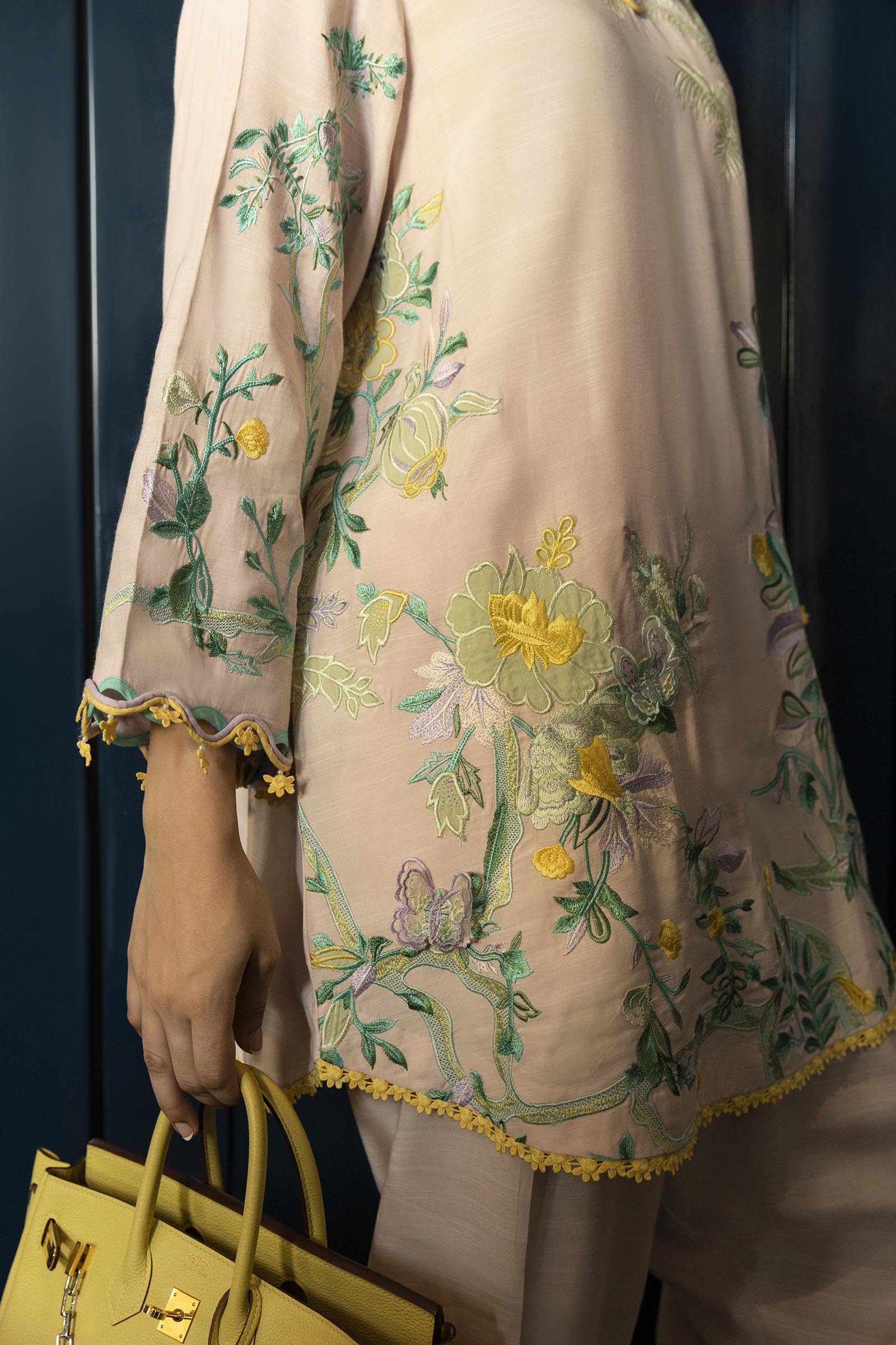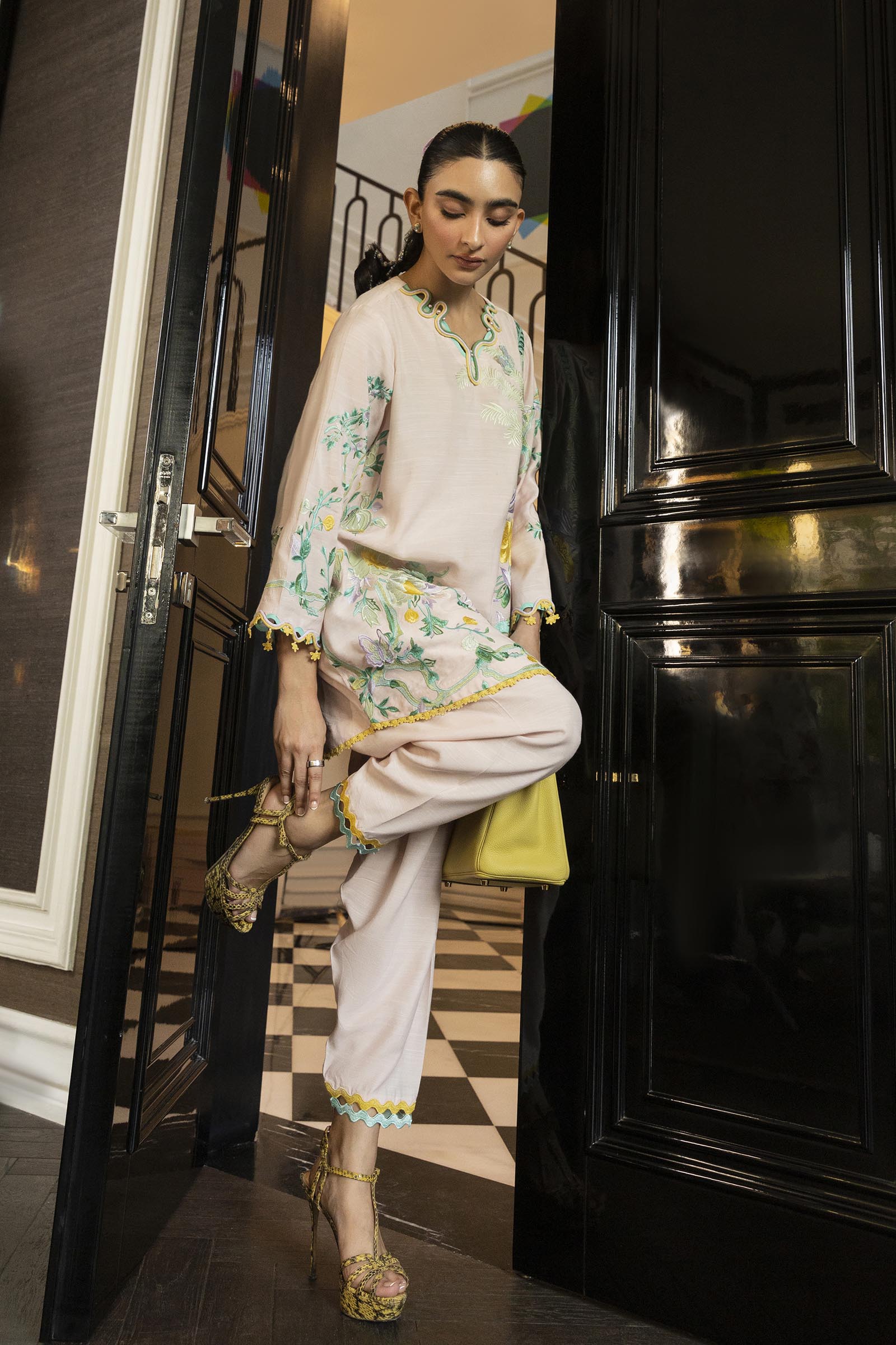 Description: Pink raw silk ensemble with gentle flare — playful sophistication in every detail.