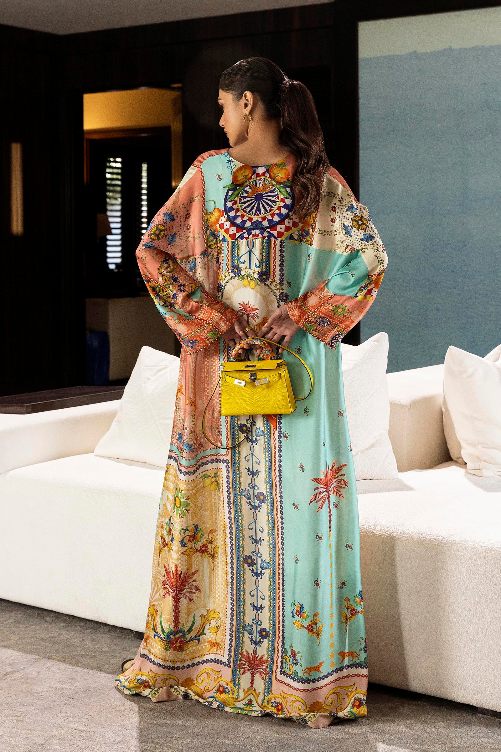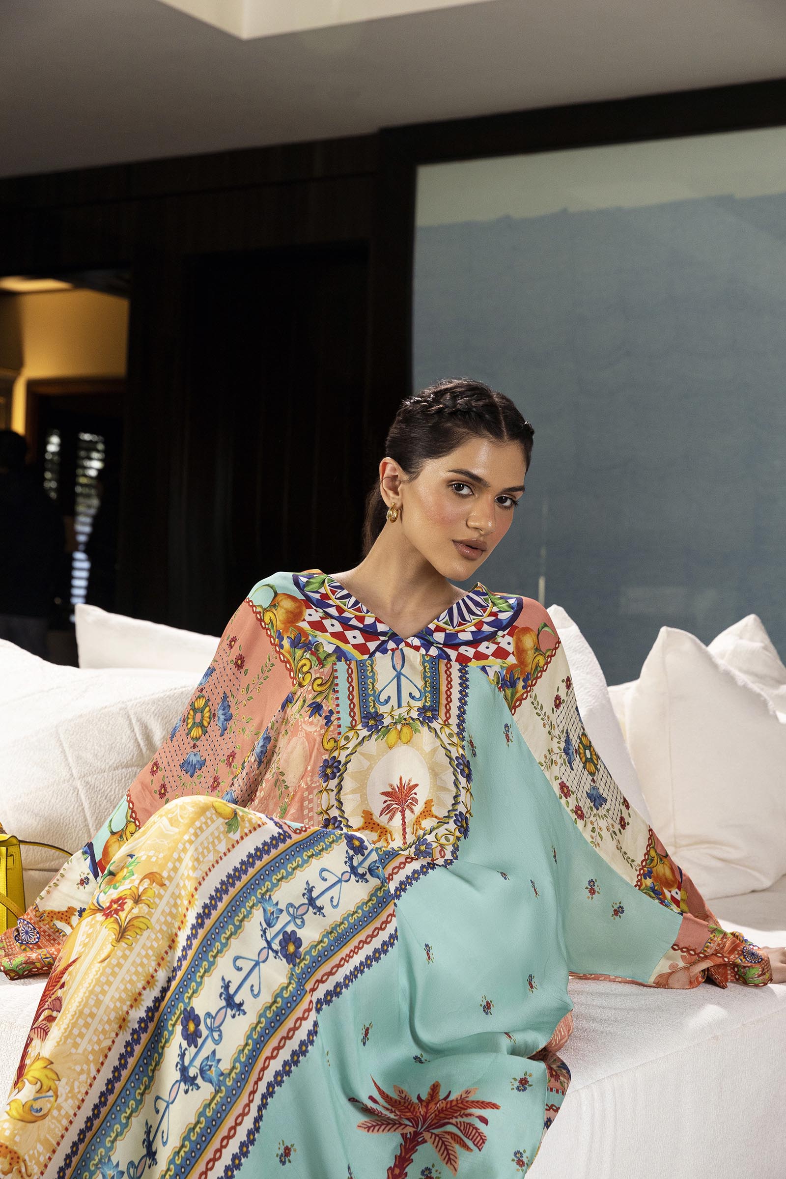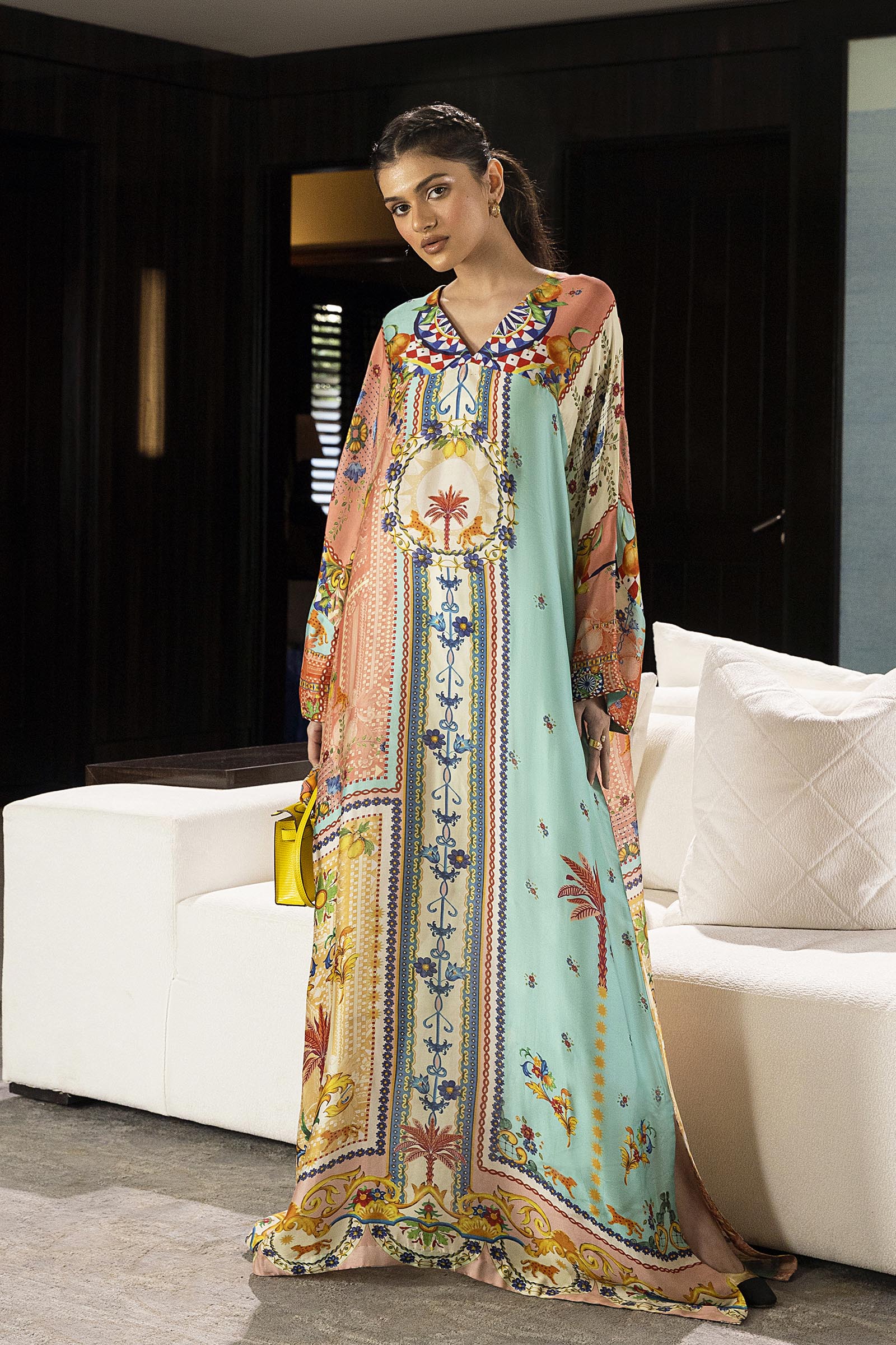 Description: A cascade of colour and pattern — a kaftan that is light, airy, and wonderfully free.