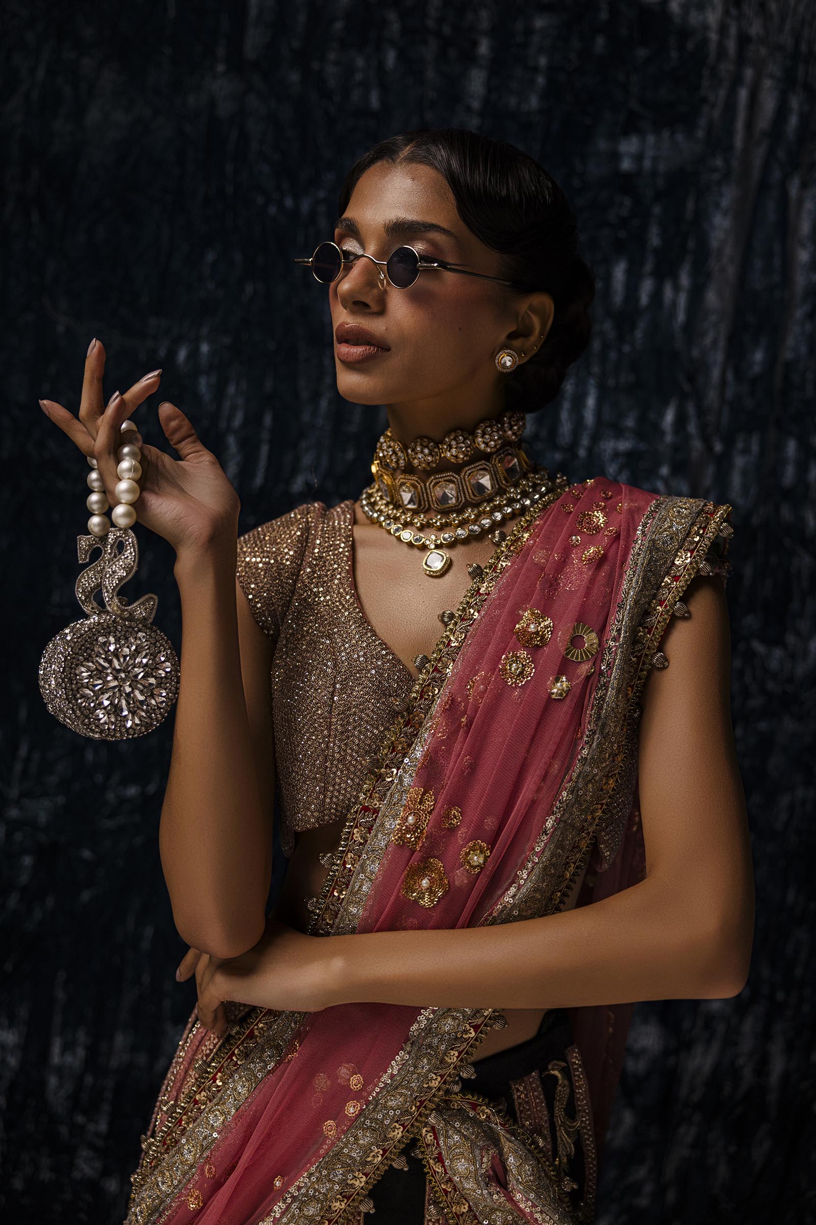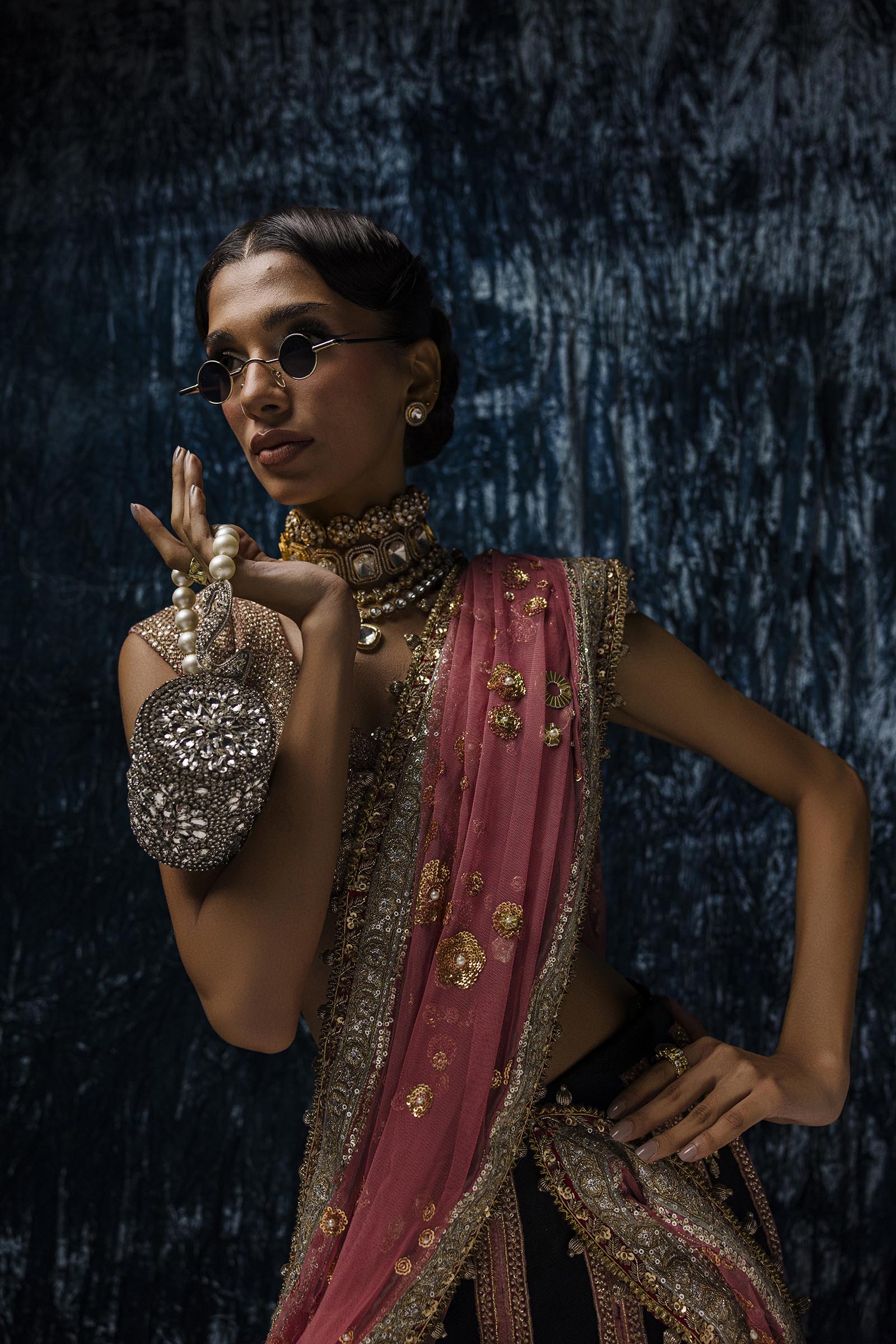 Noir tulle with antique silver and rose gold work with light refracting tube beads, gleaming crystals and shiny stones. A monochromatic look for the bride who wants to make a dramatically different style statement in a modern rendition of classical elements.