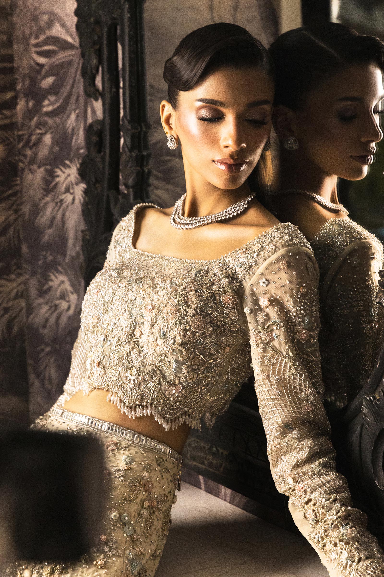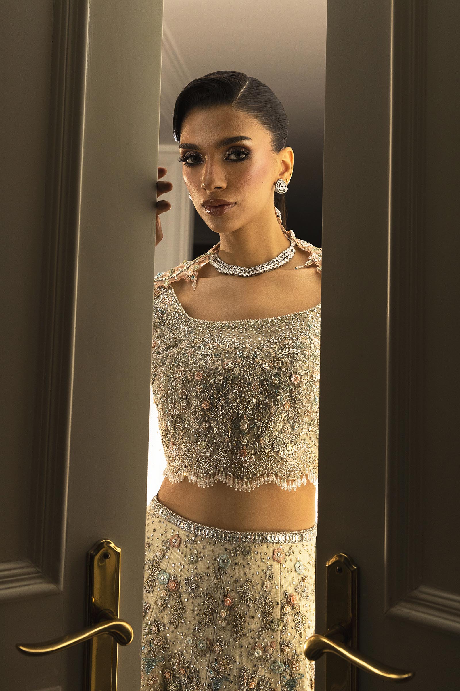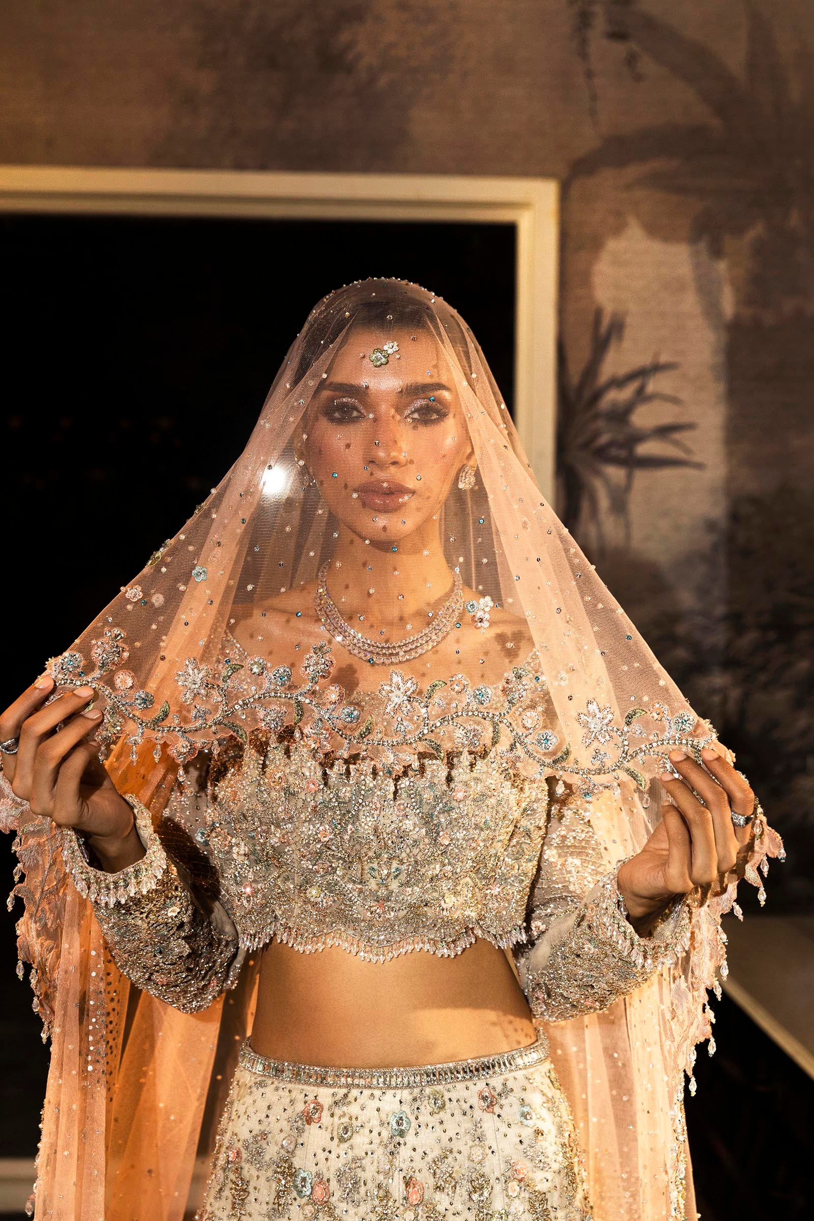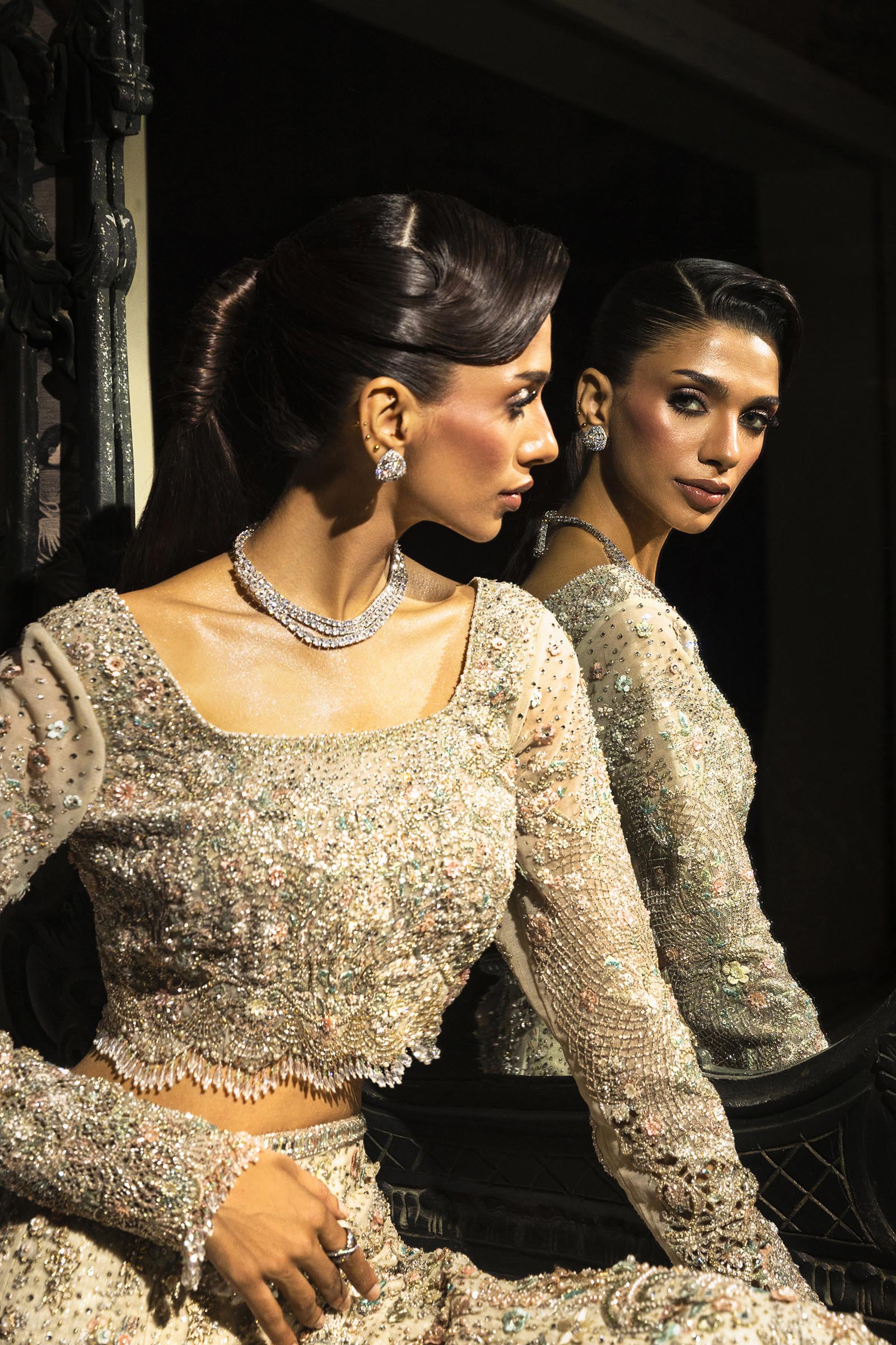 A timeless appeal that projects a dreamy spell with its ethereal detailing of precious ornaments. The mesmerizing look is enhanced by a soft hued dupatta with handcrafted border, making the enchantment of its heavenly aesthetic more appealing.