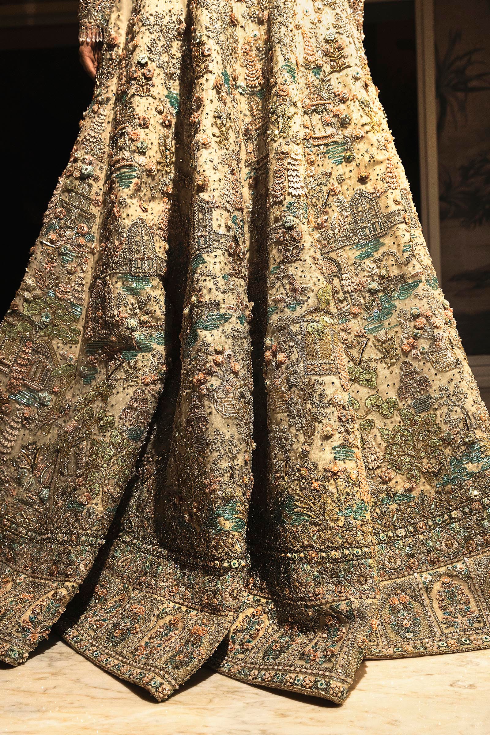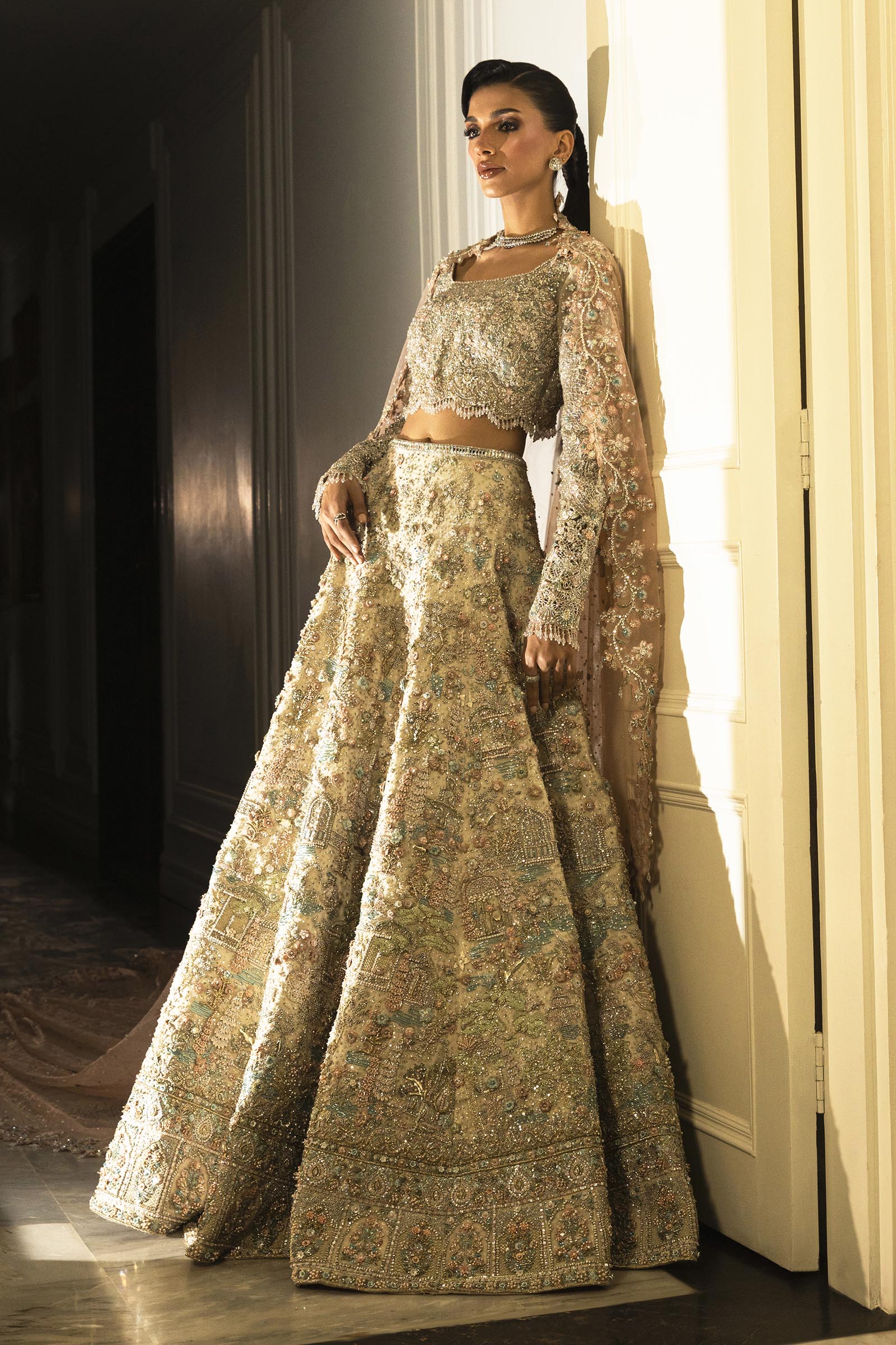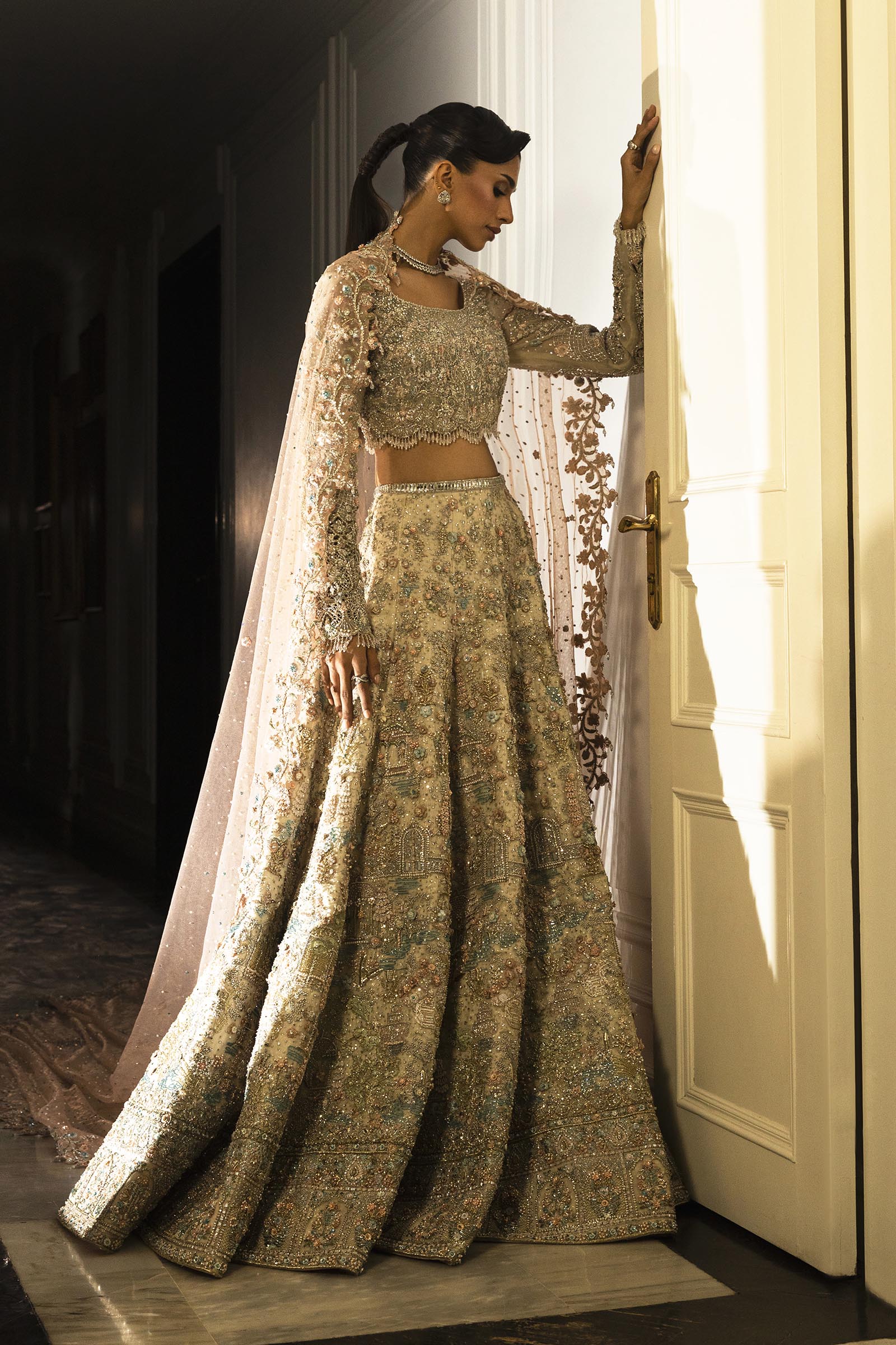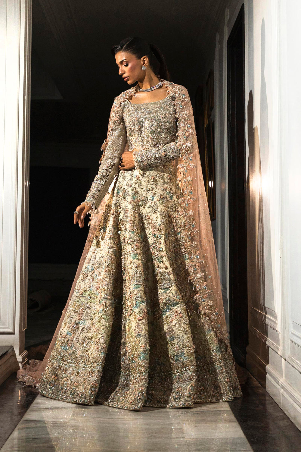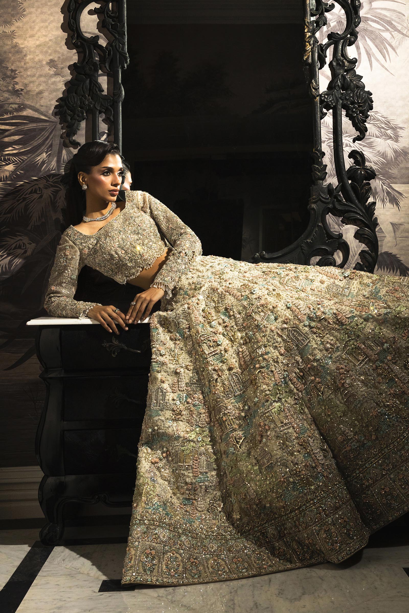 A timeless appeal that projects a dreamy spell with its ethereal detailing of precious ornaments. The mesmerizing look is enhanced by a soft hued dupatta with handcrafted border, making the enchantment of its heavenly aesthetic more appealing.