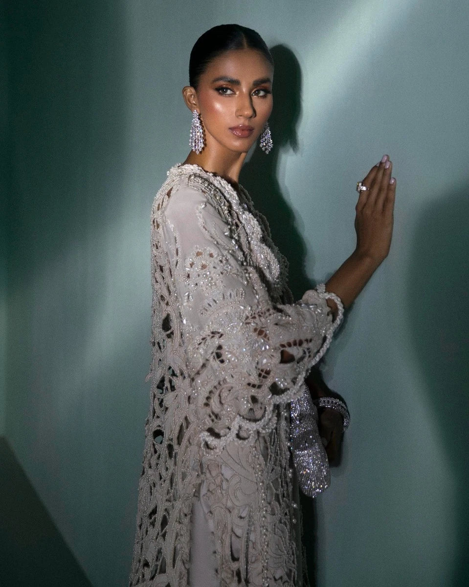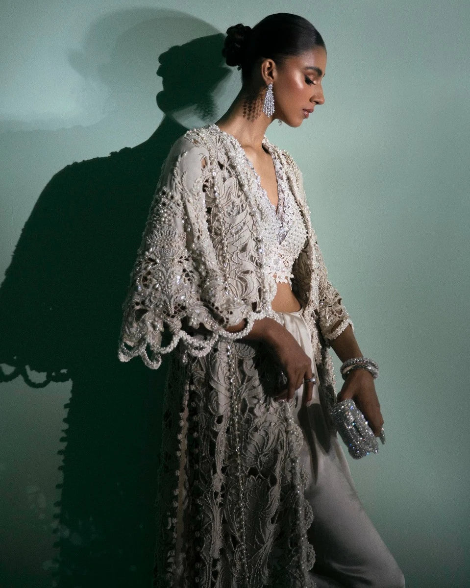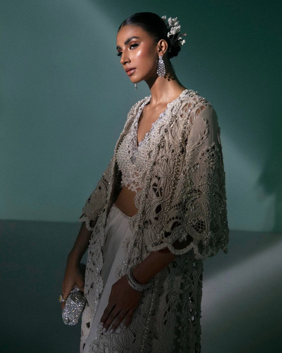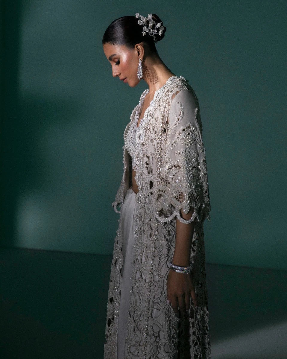 Our "Noor" collection is poetic, opulent, and luxuriant in every way. This exquisite ensemble, rendered in threads of grandeur and draped in themes of a bygone era, speaks for itself.