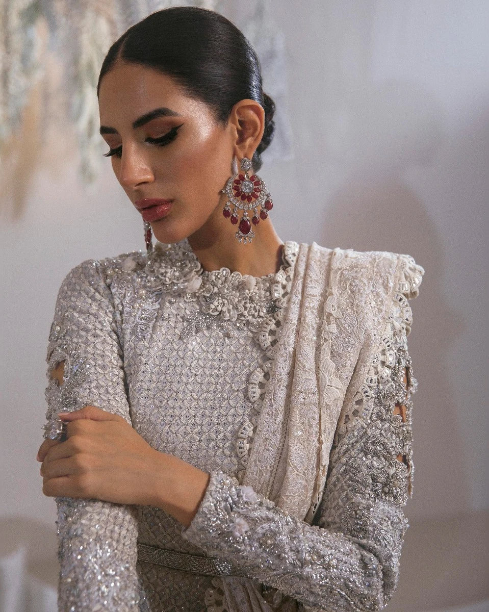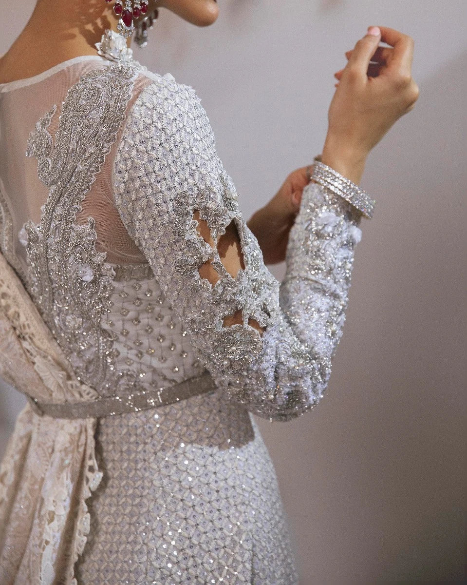 Our "Noor" collection is poetic, opulent, and luxuriant in every way. This exquisite ensemble, rendered in threads of grandeur and draped in themes of a bygone era, speaks for itself.
