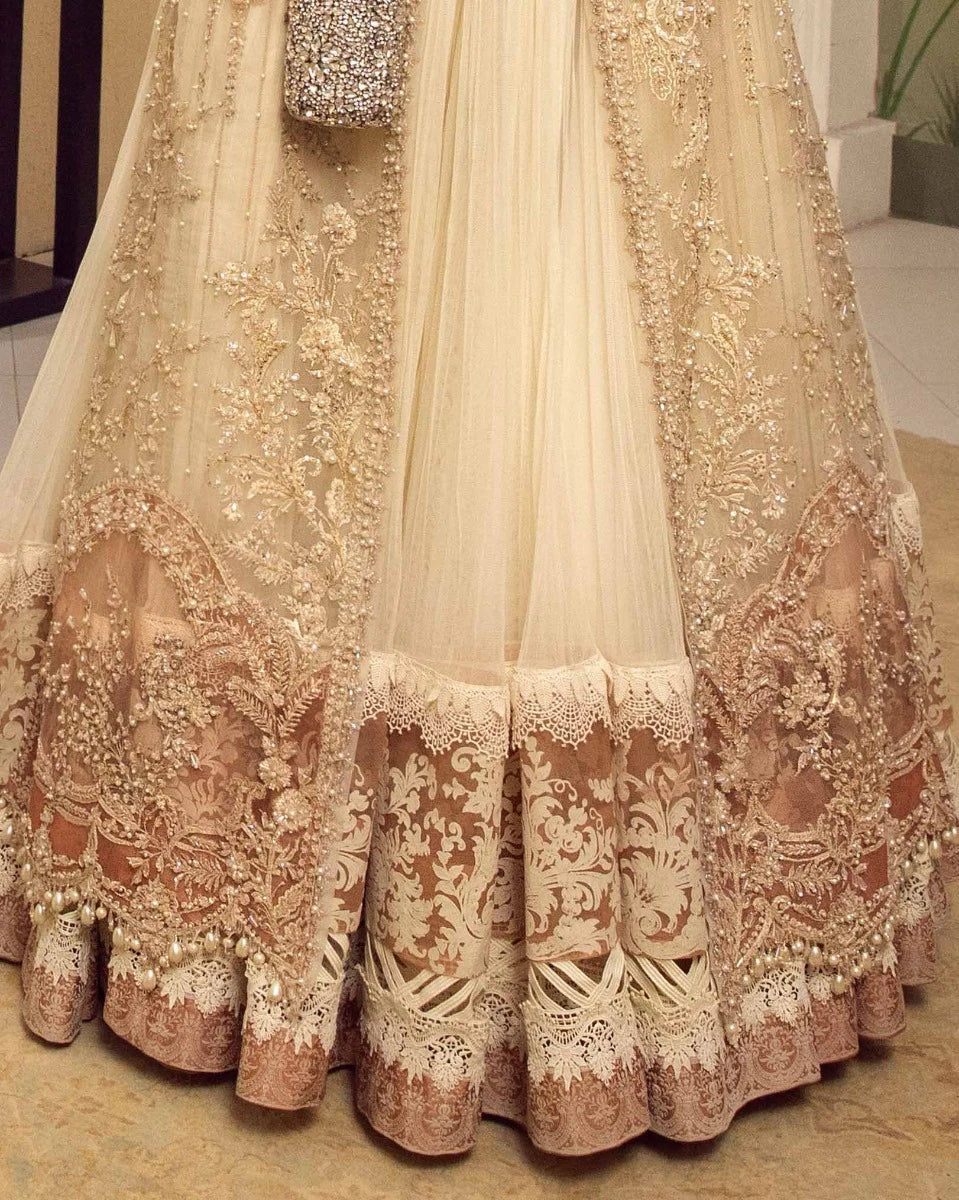 The inner skirt extends in a soft net with a flock printed border, finished with crochet laces and hand embroidered with pearls with milky crystals, sequins and a smattering of pink crystals.