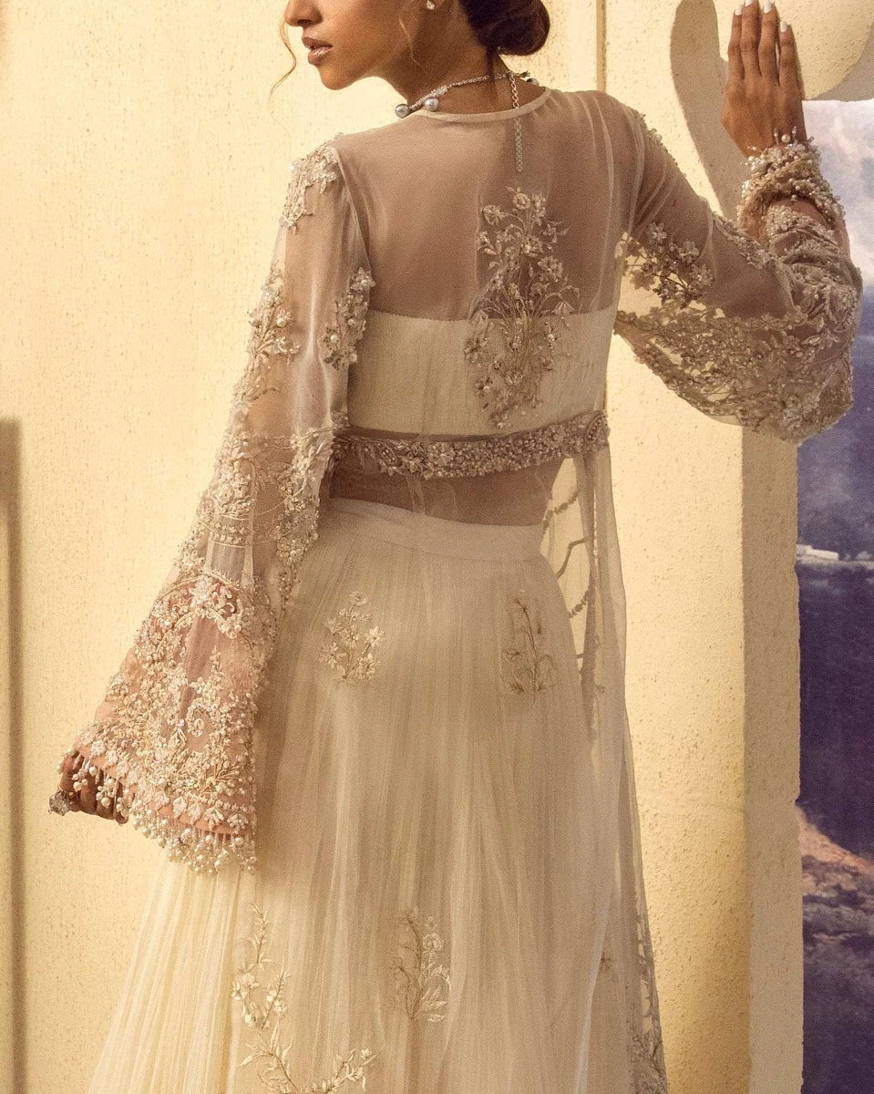 Inspired by a floral reckoning, this dainty and feminine ensemble comes in an amalgamation of ivory and tea pink. This long front-open organza shirt is embroidered resham work and liberally embellished with pearls on the front, back and sleeves.