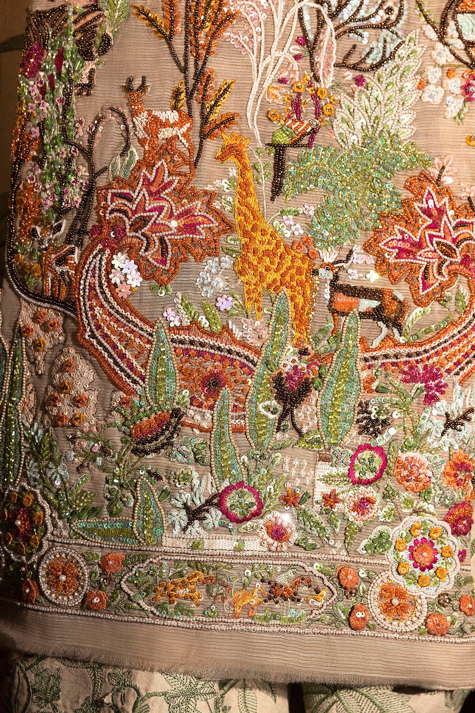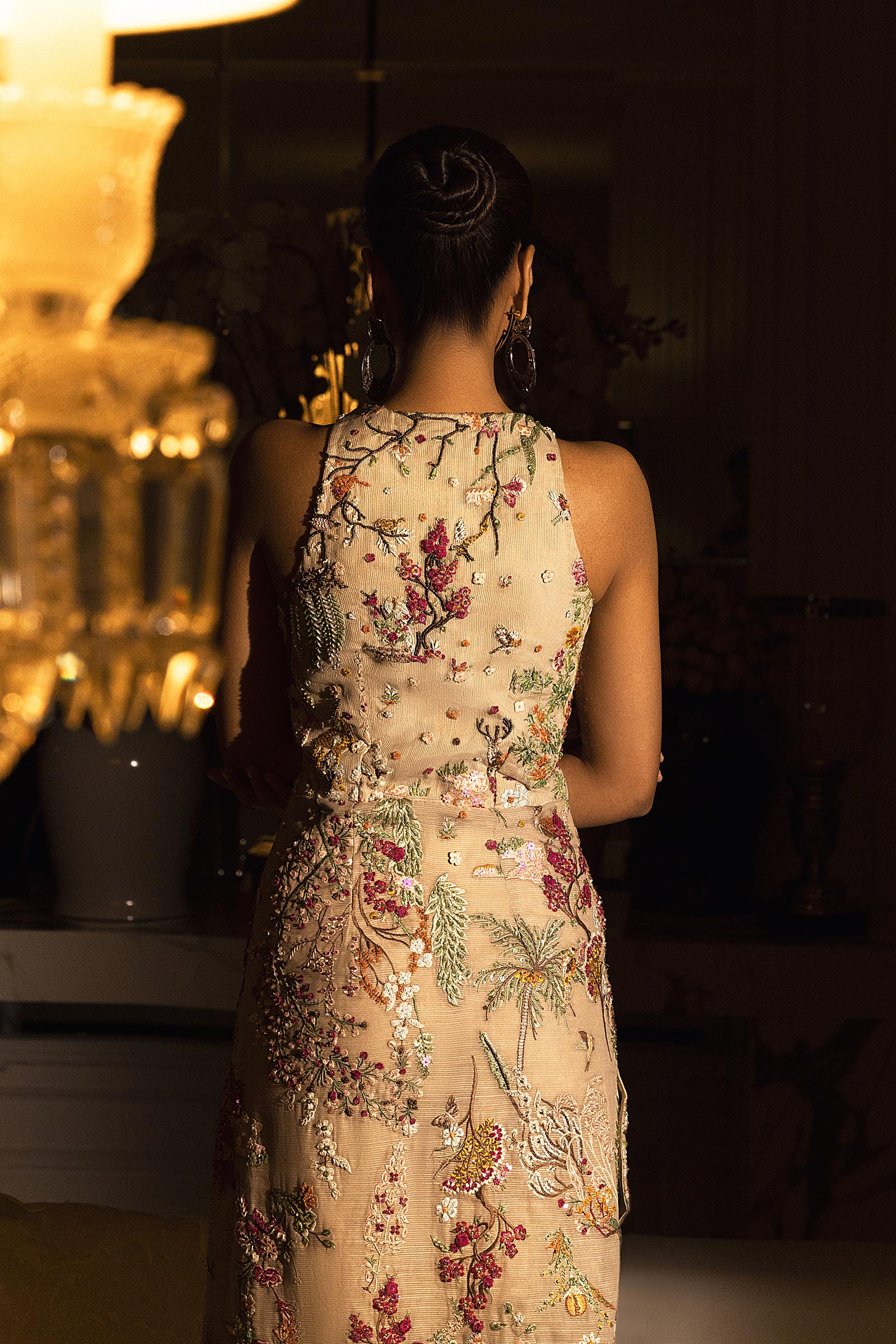 A statement long shirt adorned with intricate handwork and delicate floral detailing. Thoughtful pops of colour illuminate the ornate surface, creating a richly layered look that feels expressive, refined, and radiant through the night.