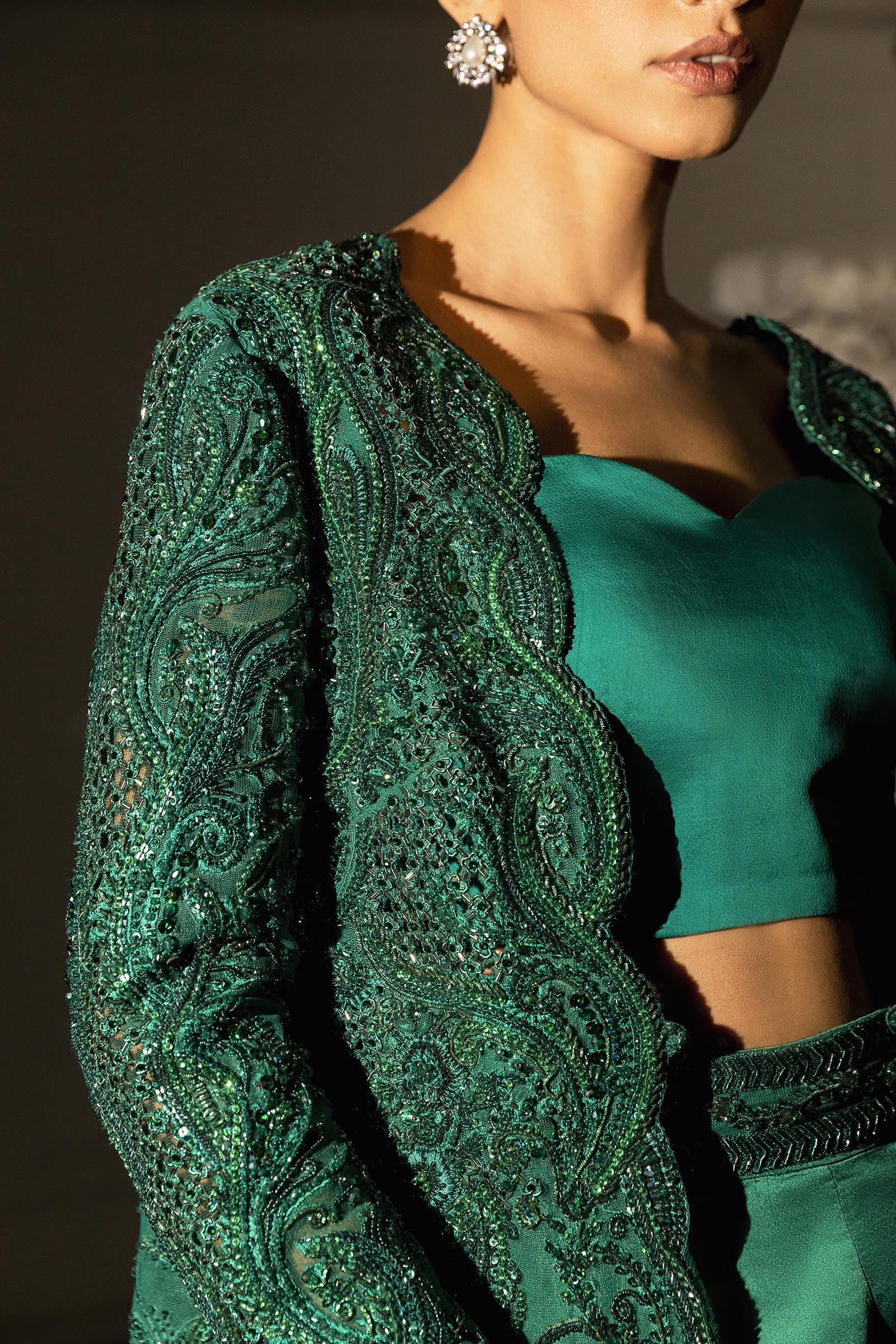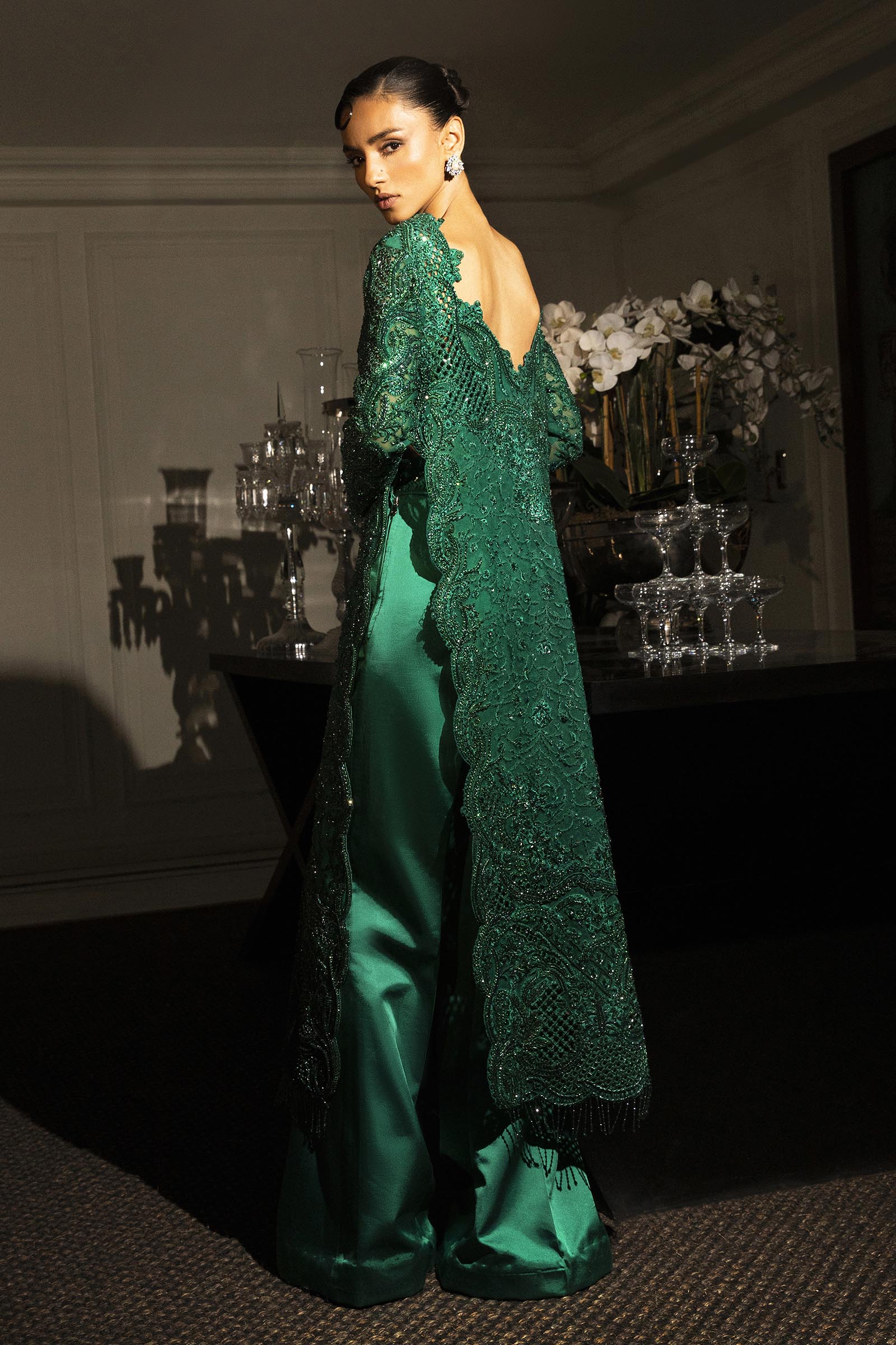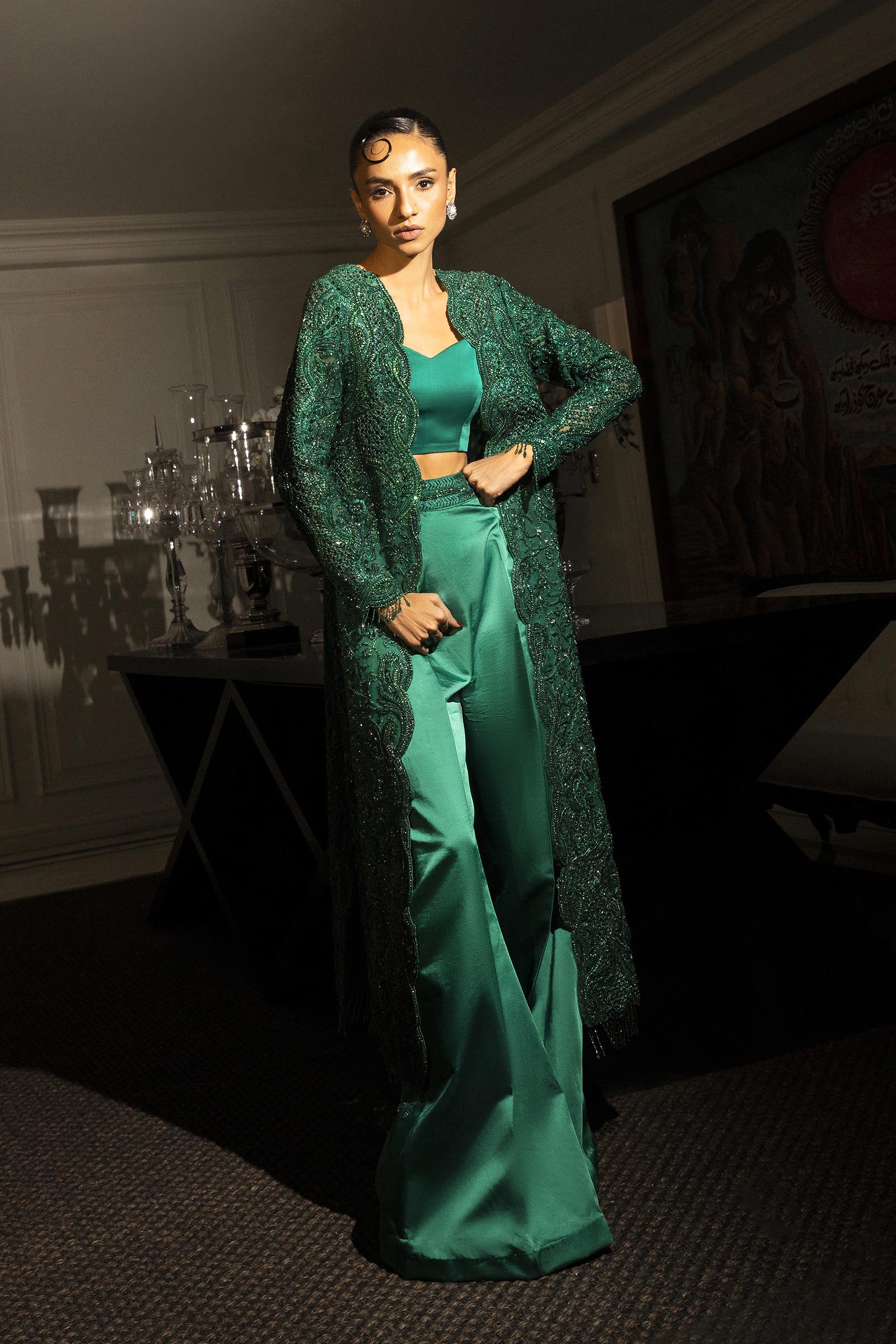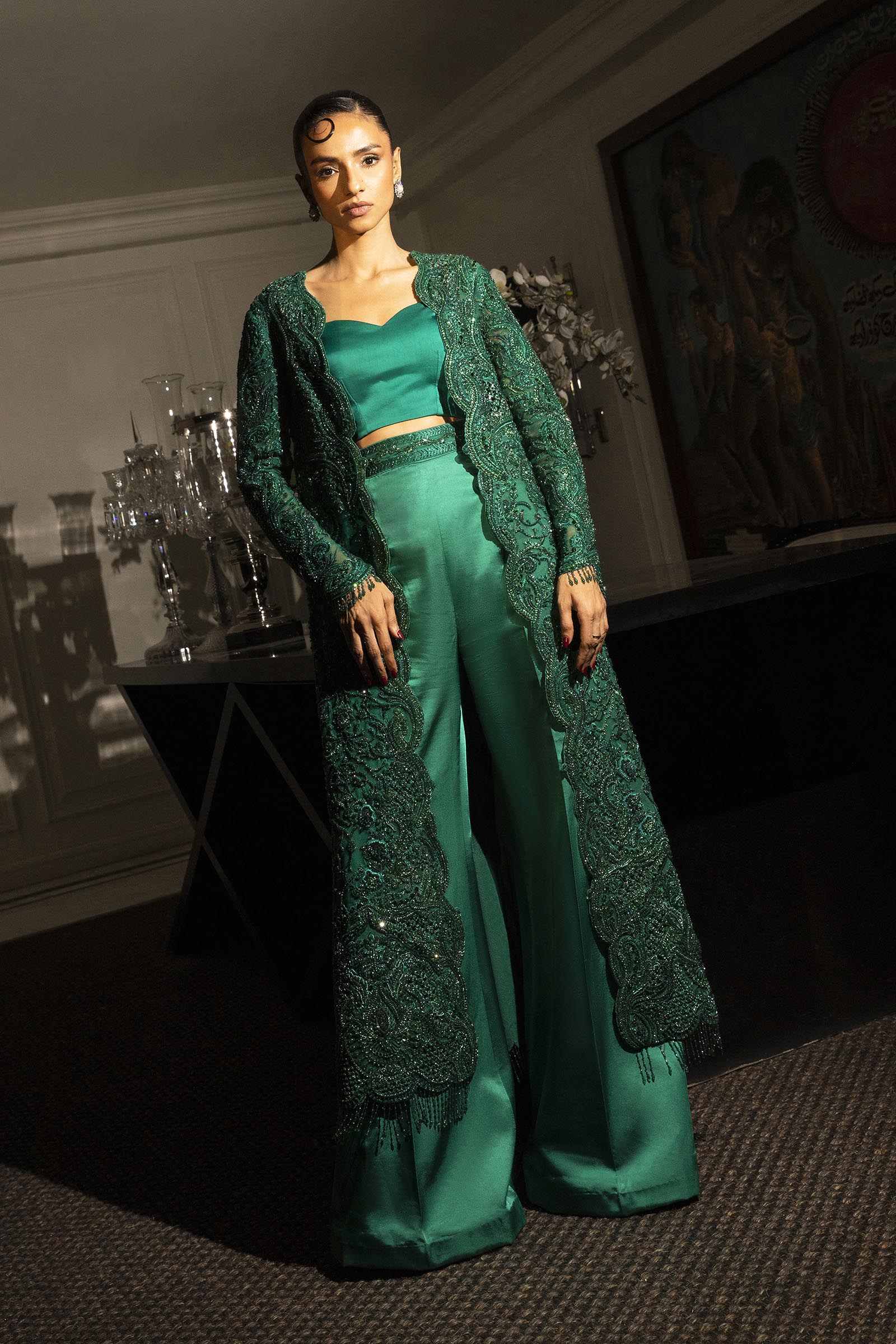 A verdant-hued modern-cut long shirt paired with flared pants, adorned with self-on-self handwork throughout. Fully embellished and impeccably crafted, it blends contemporary silhouette with timeless elegance.