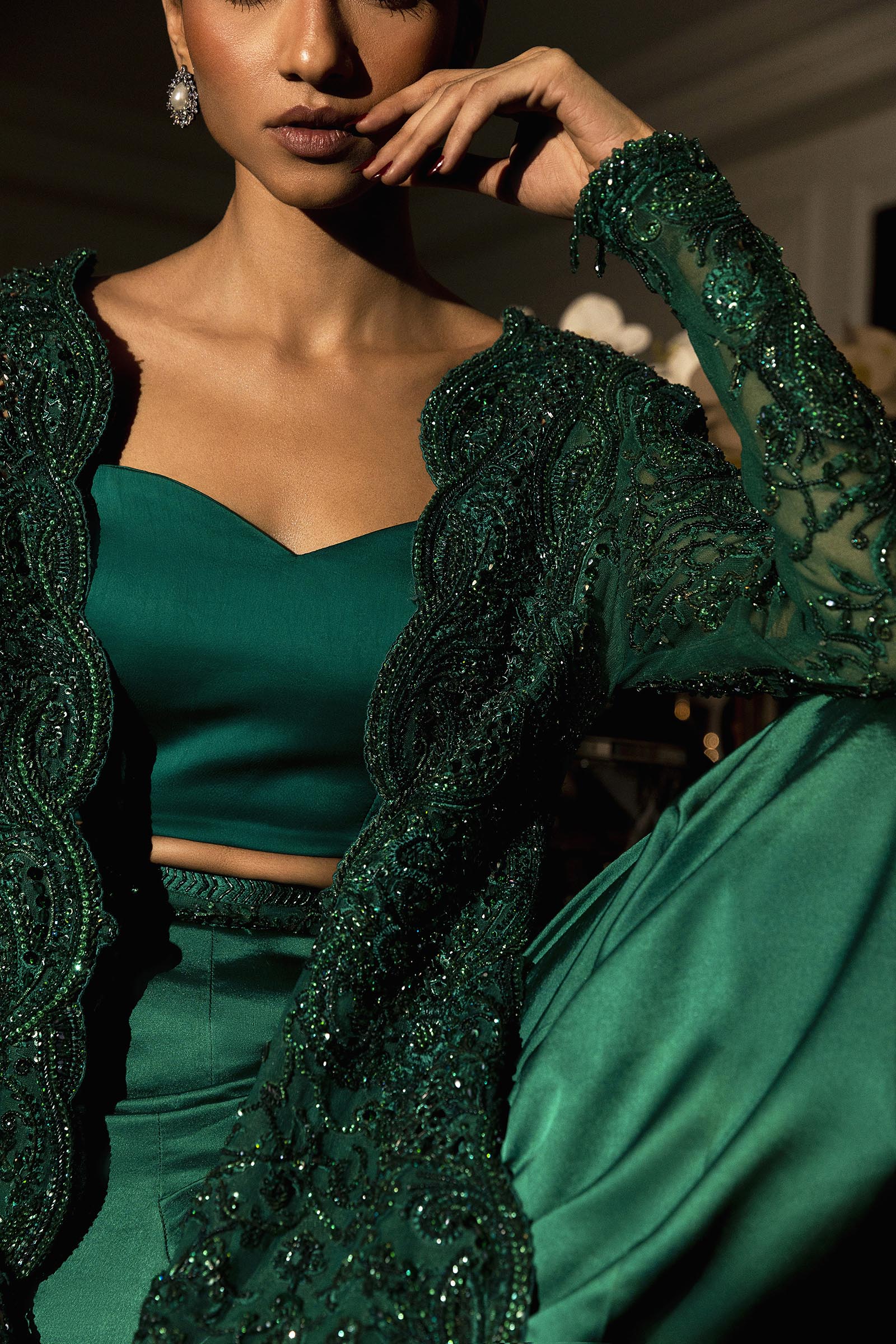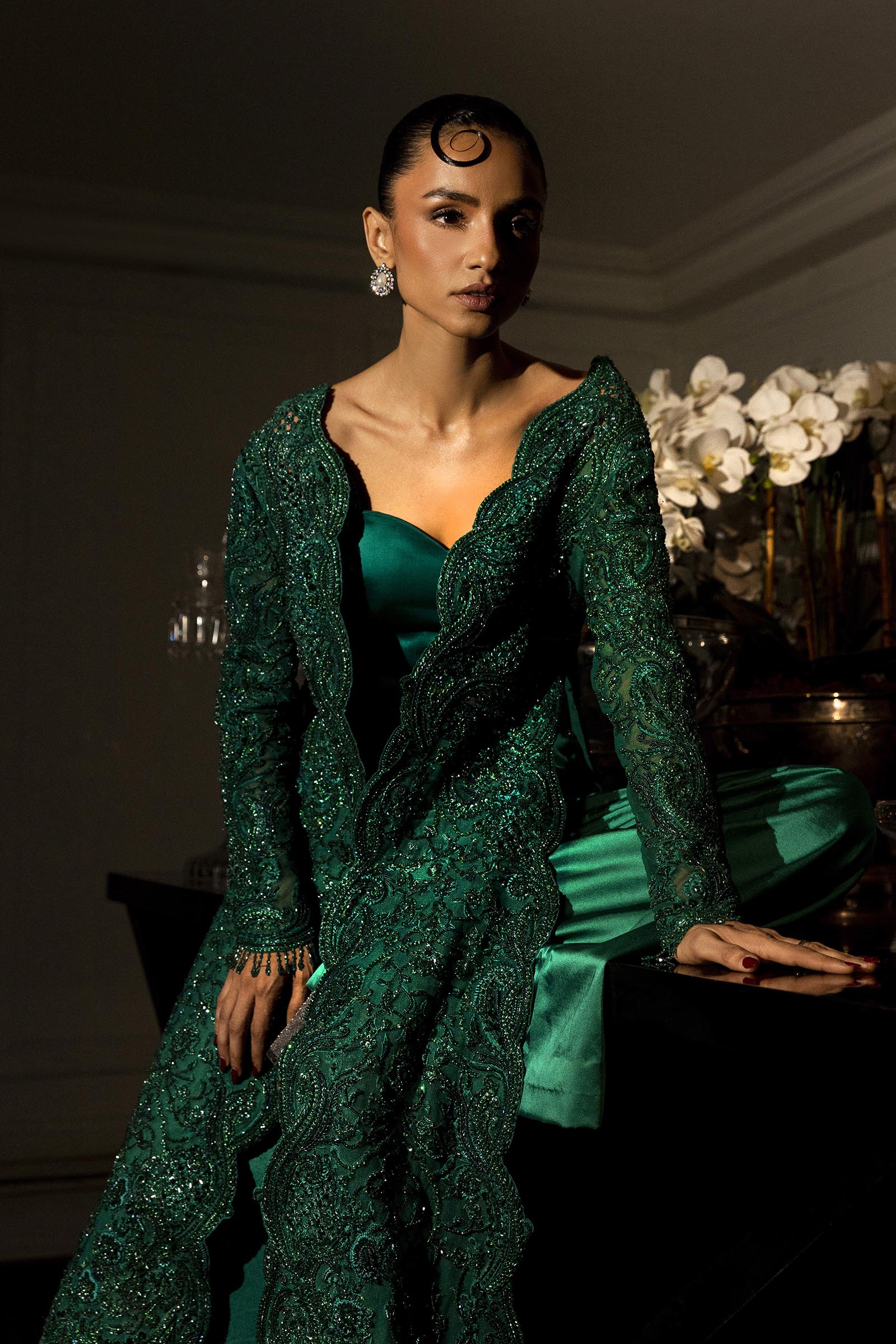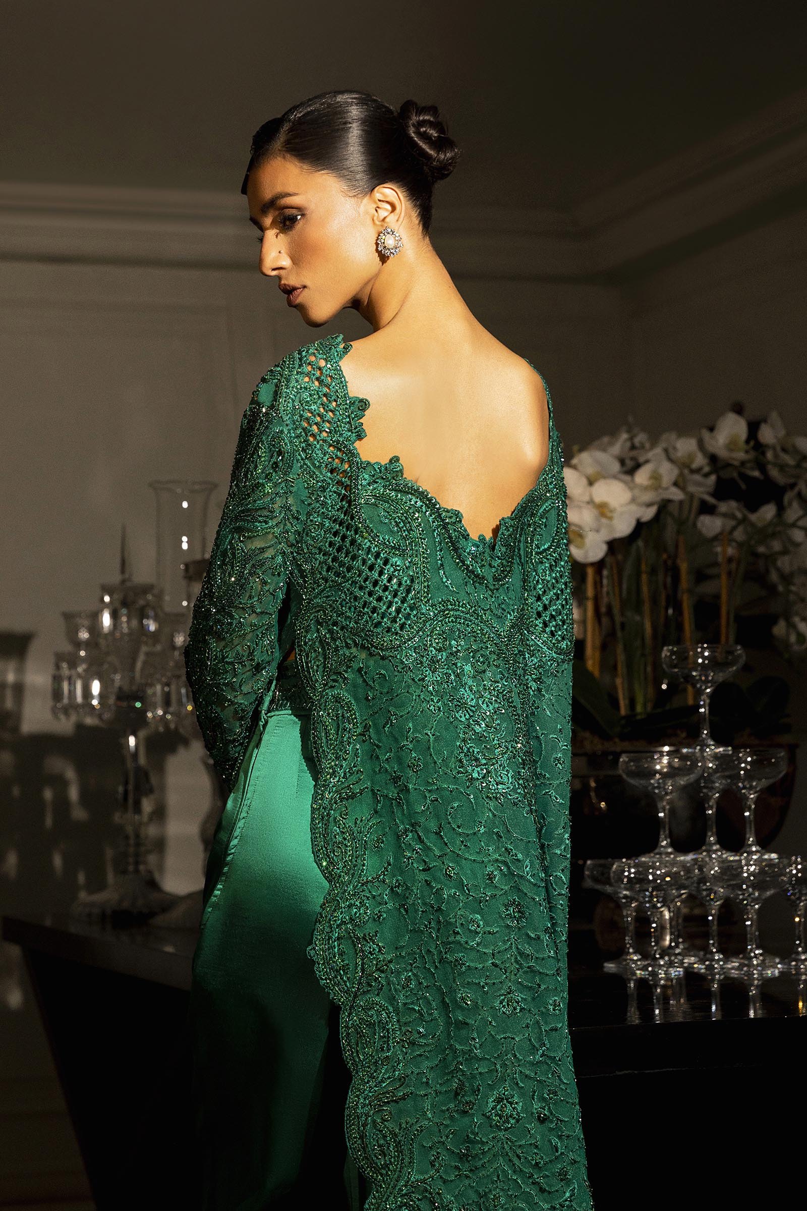A verdant-hued modern-cut long shirt paired with flared pants, adorned with self-on-self handwork throughout. Fully embellished and impeccably crafted, it blends contemporary silhouette with timeless elegance.