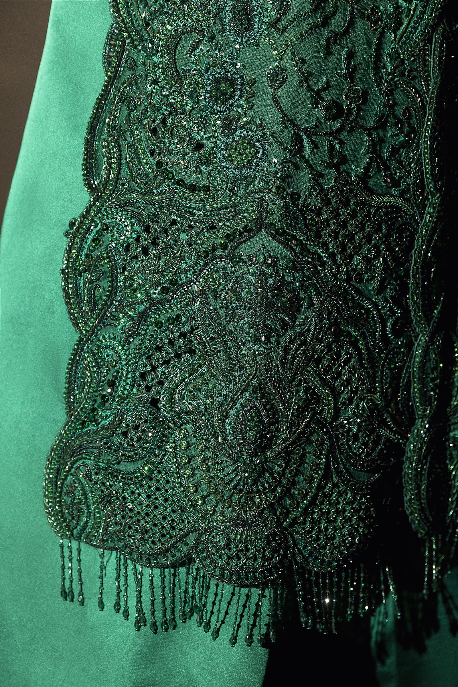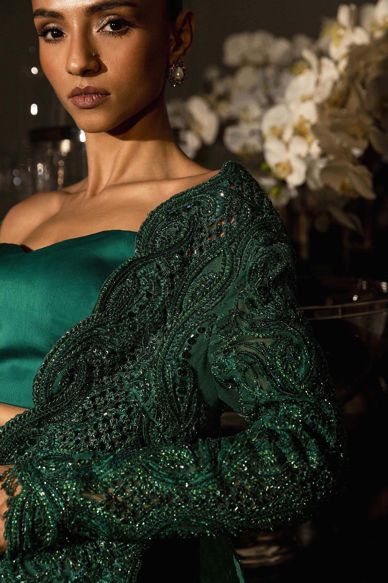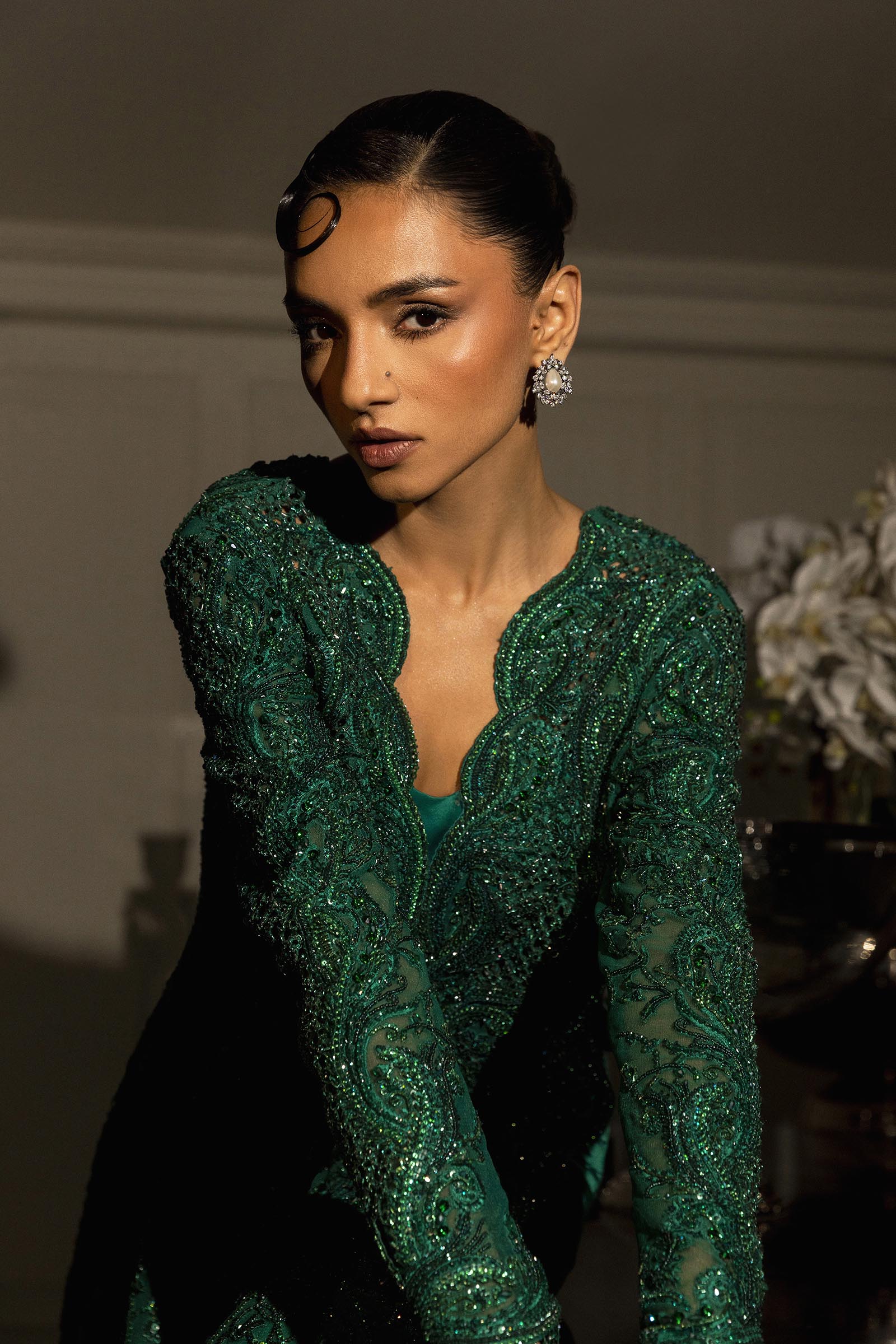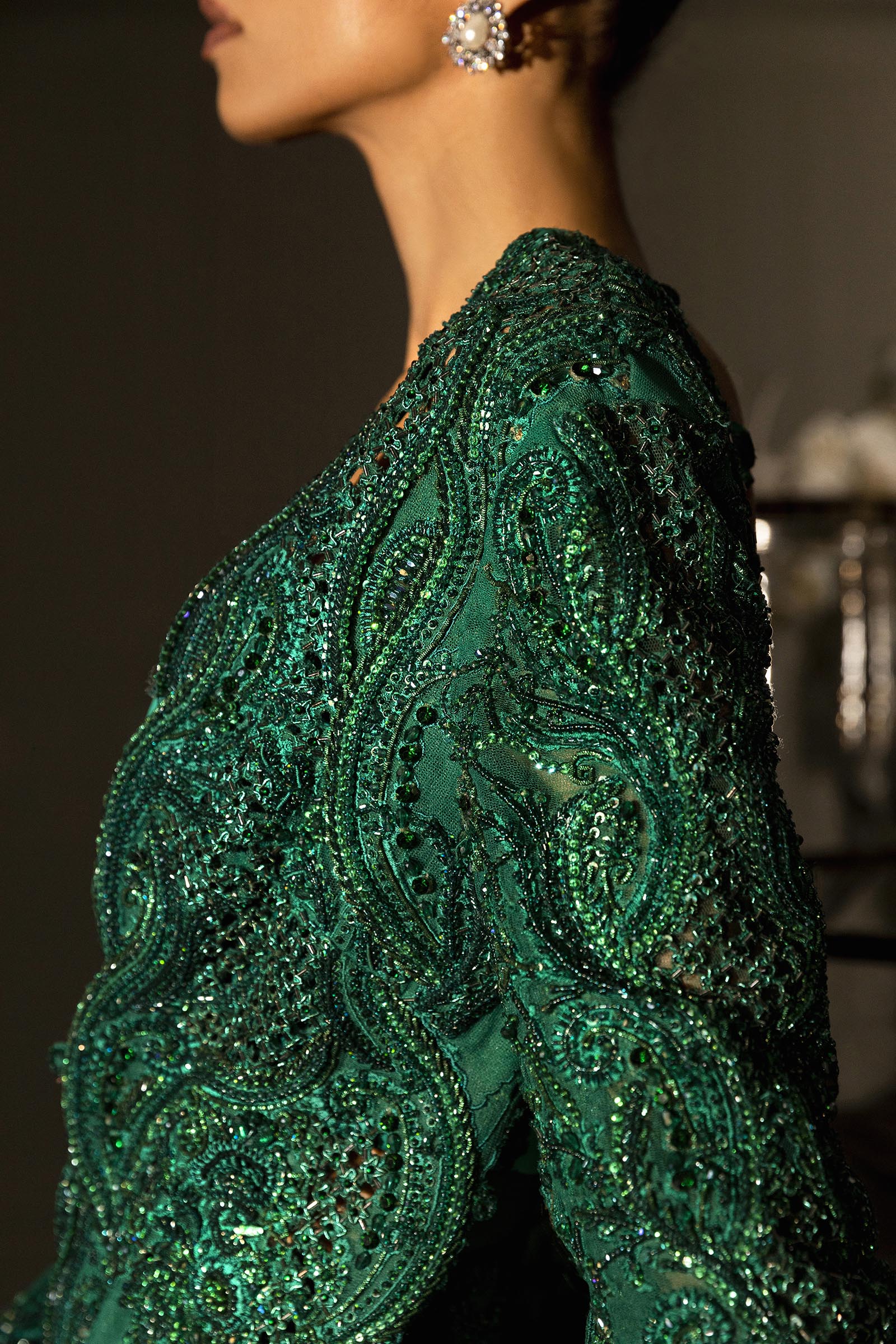 A verdant-hued modern-cut long shirt paired with flared pants, adorned with self-on-self handwork throughout. Fully embellished and impeccably crafted, it blends contemporary silhouette with timeless elegance.