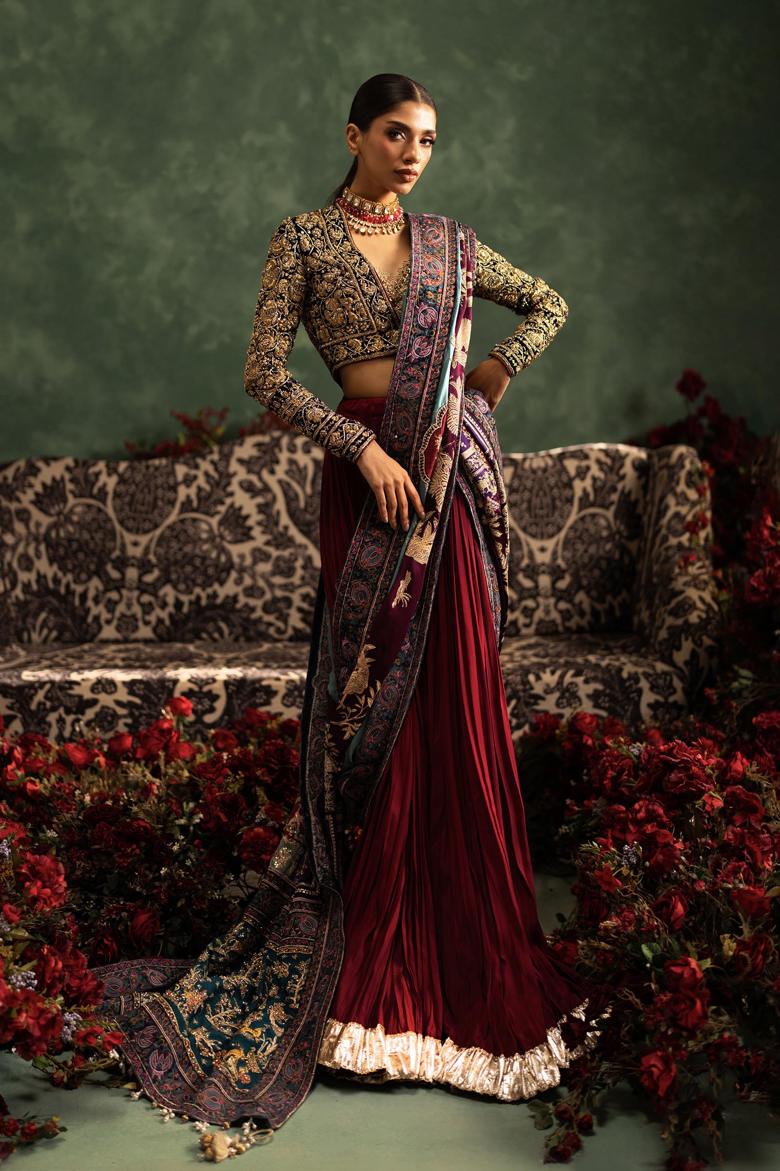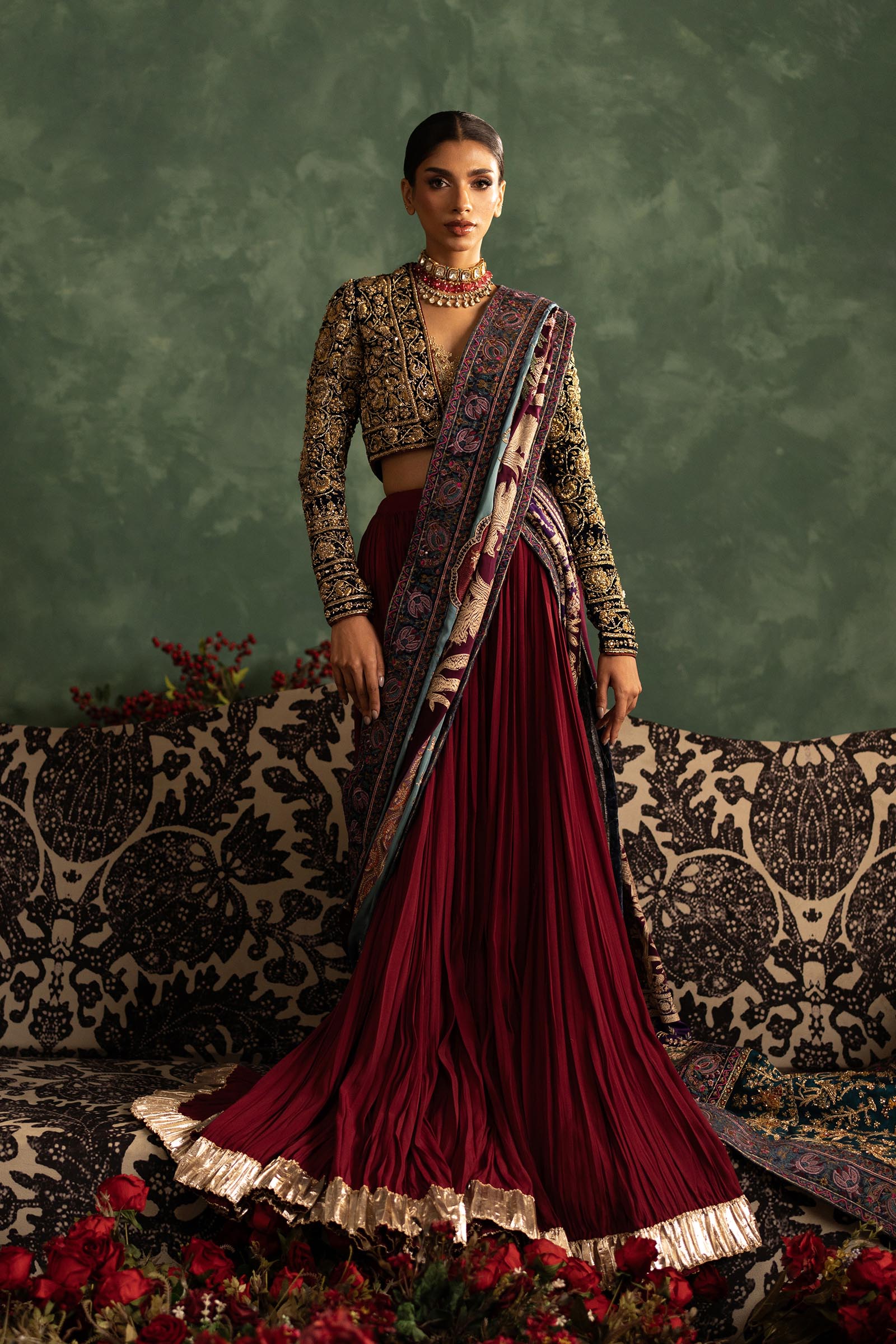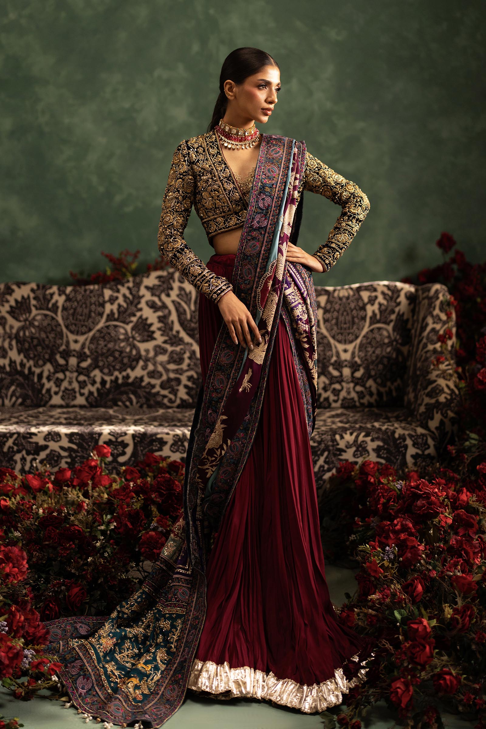 Our in-house design consultant will get in touch with you to assist on sizing and customization. They will personally send over your design calico and color swatches to ensure an ensemble that perfectly meets all your requirements. We tailor each outfit to your size and preference. For all international orders, our consultants will be available to meet with you via Zoom to get your measurements and tailor the outfit according to your size. We hope to customize your outfit to perfection to deliver the best couture ensemble to you.