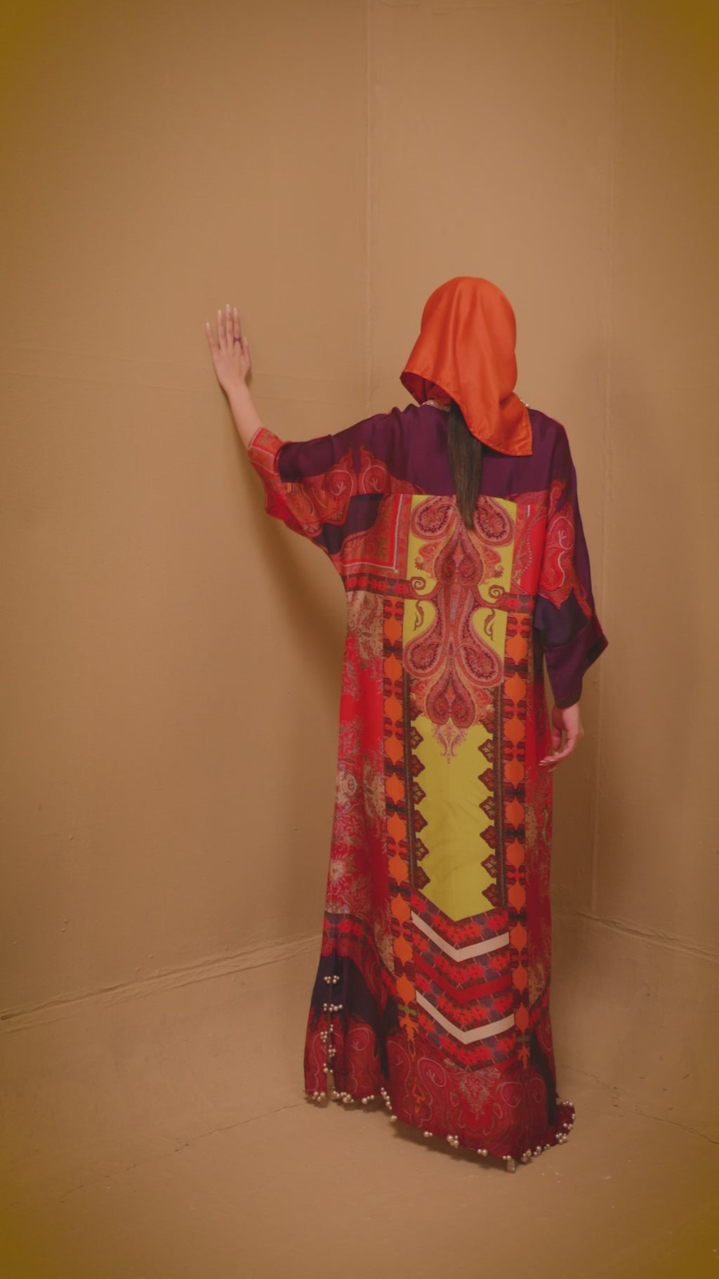 PRODUCT DESCRIPTION: A kaftan in pure pearl silk that plays with contrasting colours — soft yet expressive, with an effortless sense of style.