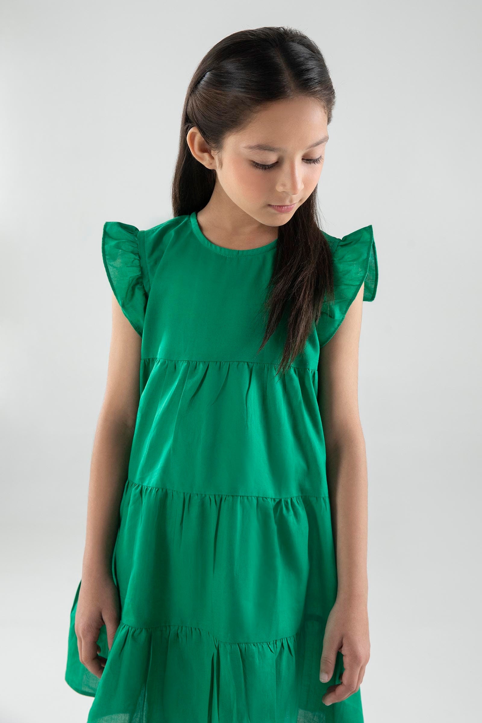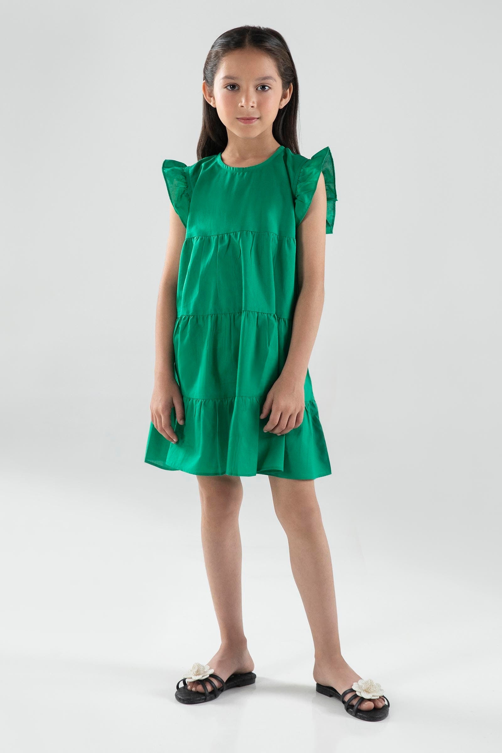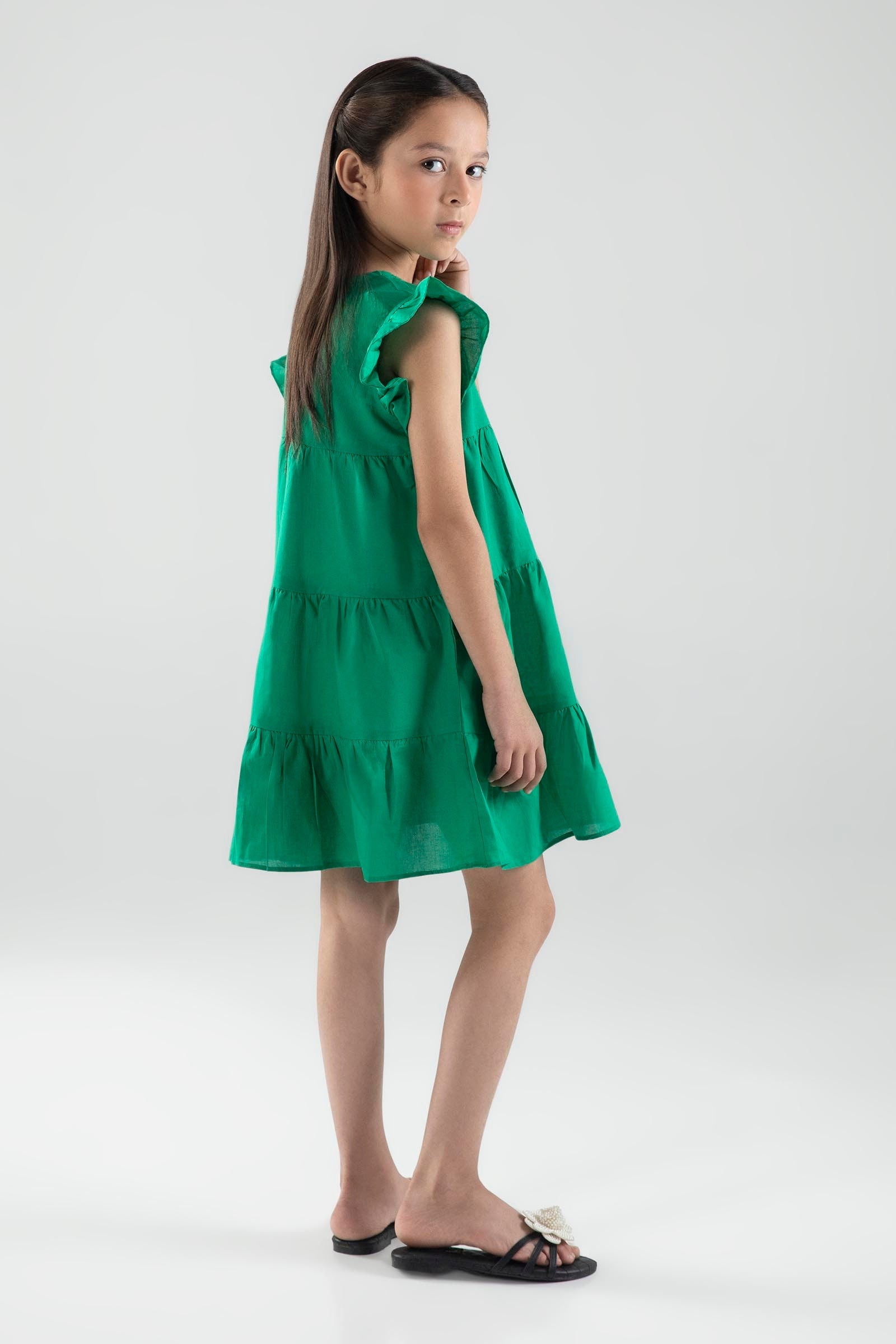 Description: Little fashionistas, all dressed up in a modern emerarld green frock silhouette.
