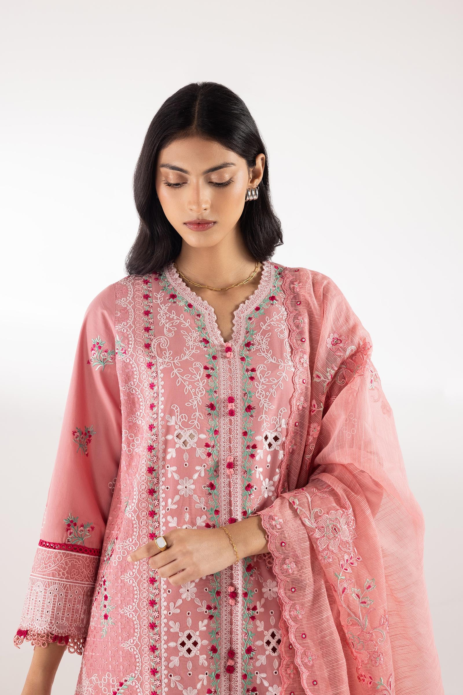 Dupatta: Pink Embroidered Cotton Net Dupatta Included