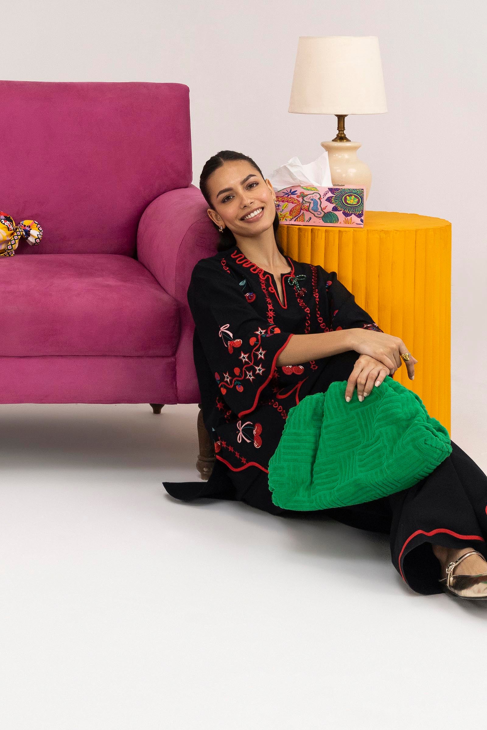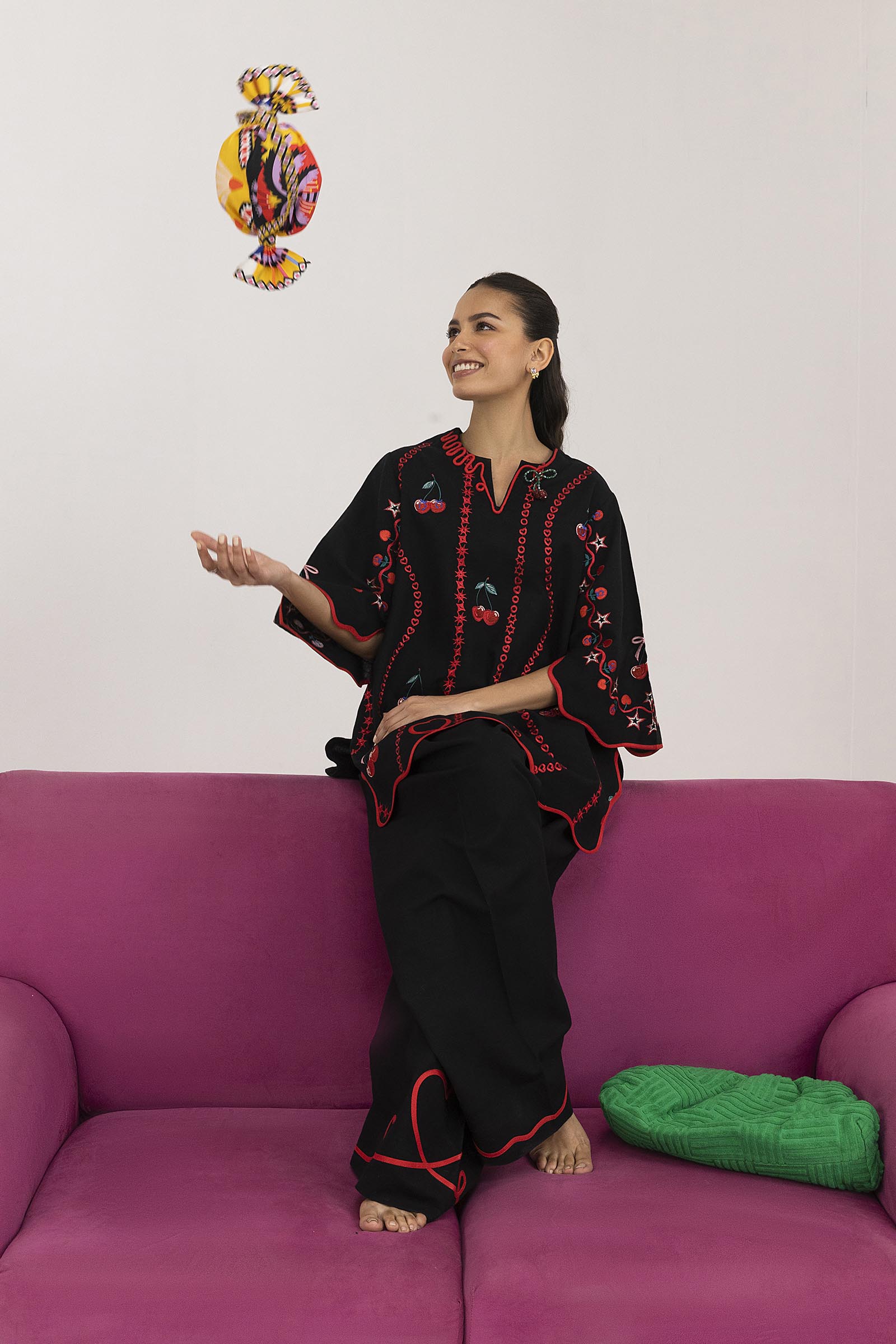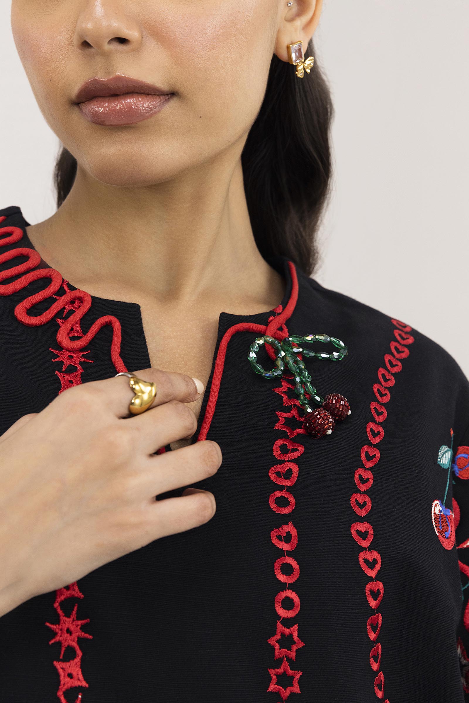 Description: Embroidered black and red with playful cherry accents for a fun winter look.