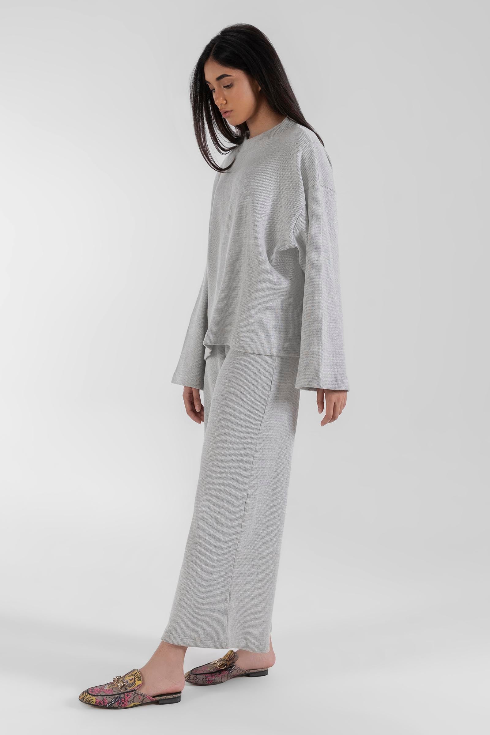 Description: Casual co-ord set – a snug full-sleeved top with a chic round neck paired with bottoms featuring a playful flair flap from the hem.